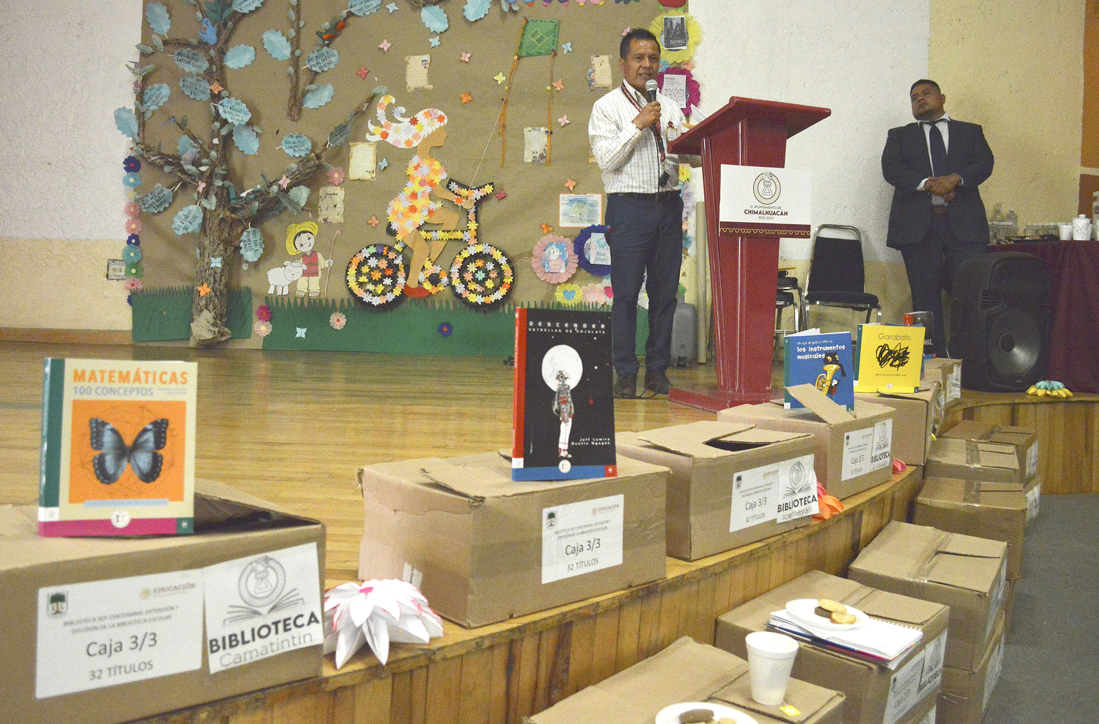 Durante el evento, realizado en la Casa de Cultura de la Cabecera Municipal, cada una de las nueve bibliotecas públicas recibió tres cajas de libros de las manos de la titular de la Dirección General de Educación, del Primer Síndico Municipal y del titular del Departamento de Bibliotecas.