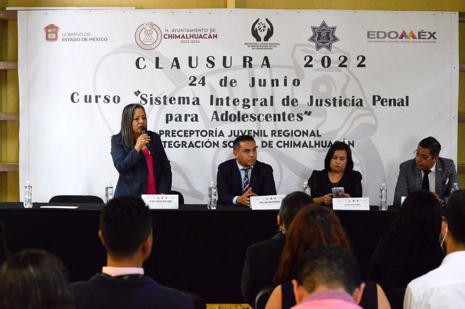 La Preceptoría Juvenil Regional de Reintegración Social de Chimalhuacán clausuró el curso “Sistema de Justicia Penal para Adolescentes”, impartido al personal de la Preceptoría, encabezada por la maestra Cándida Meza Juárez.