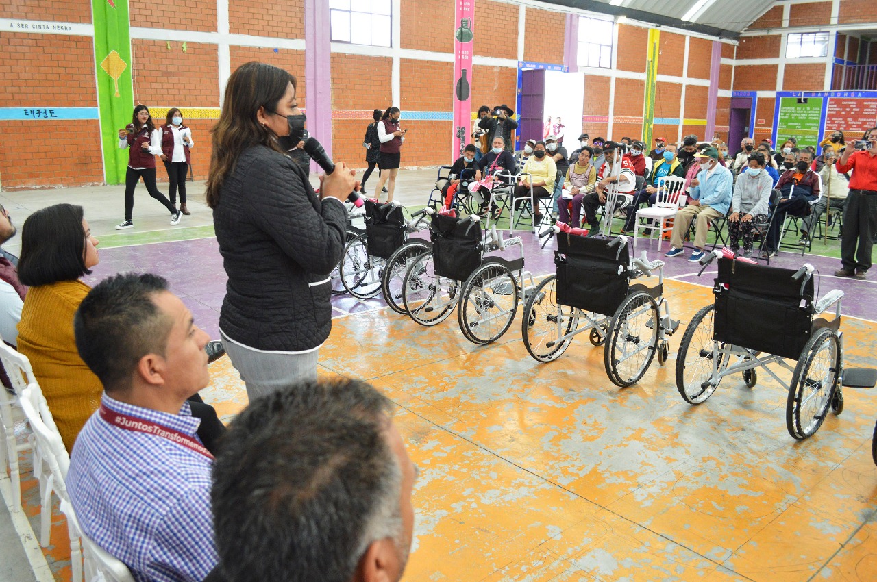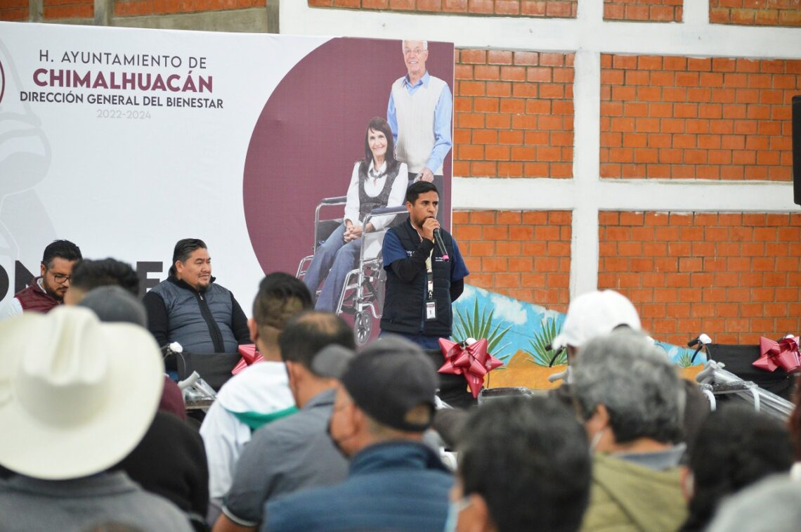 En esta ocasión, el Gobierno de Chimalhuacán hizo entrega de 10 sillas de ruedas y 40 bastones de un punto a adultos mayores y personas con capacidades diferentes que residen en el municipio.