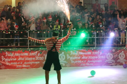 Con un espectáculo de patinadoras, payasos y botargas, fue formalmente inaugurada la Pista de hielo en la Plaza Cívica “Benito Juárez” en Barrio Vidrieros, acto en el que la Presidenta Municipal, Xóchitl Flores Jiménez, invitó a las familias chimalhuaquenses a disfrutar de la Villa navideña y la Pista de hielo con entrada gratuita, que se instaló en el municipio.