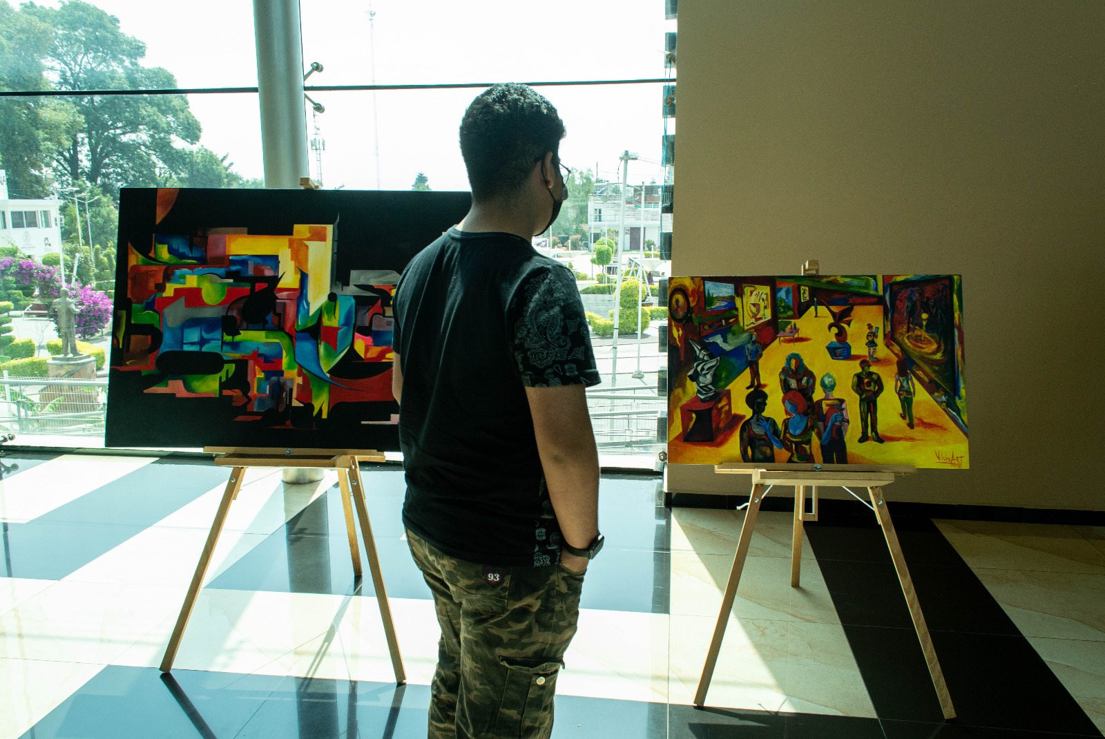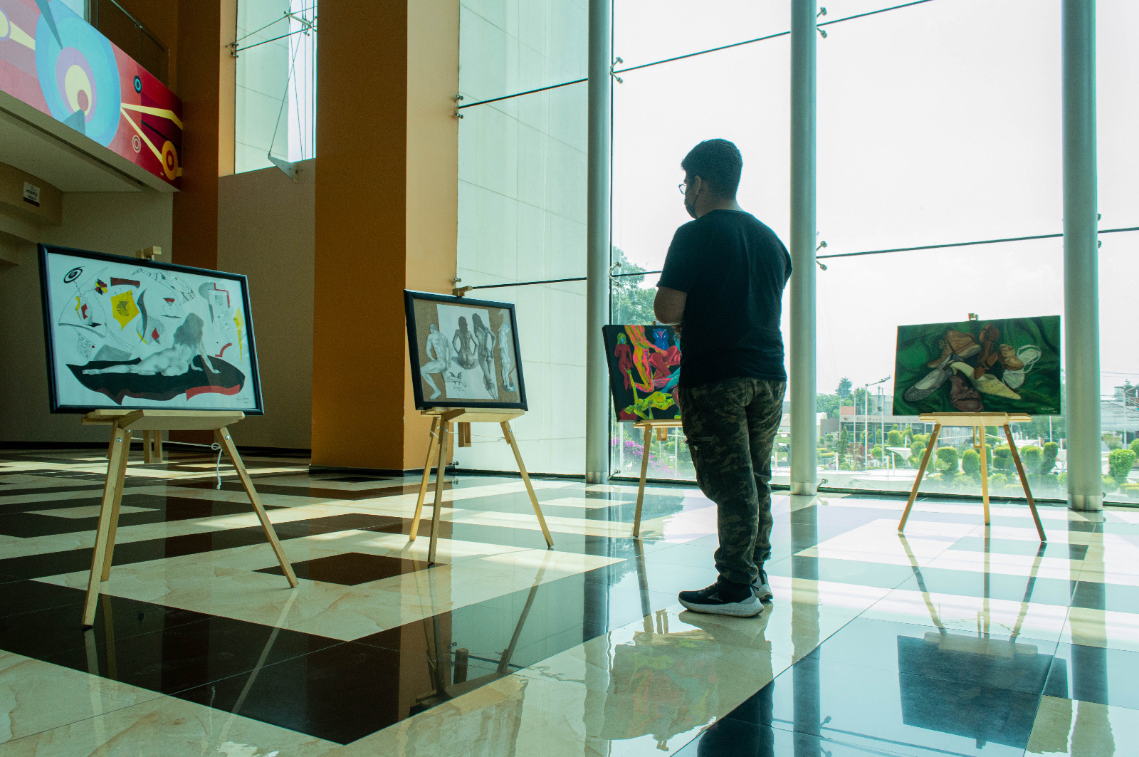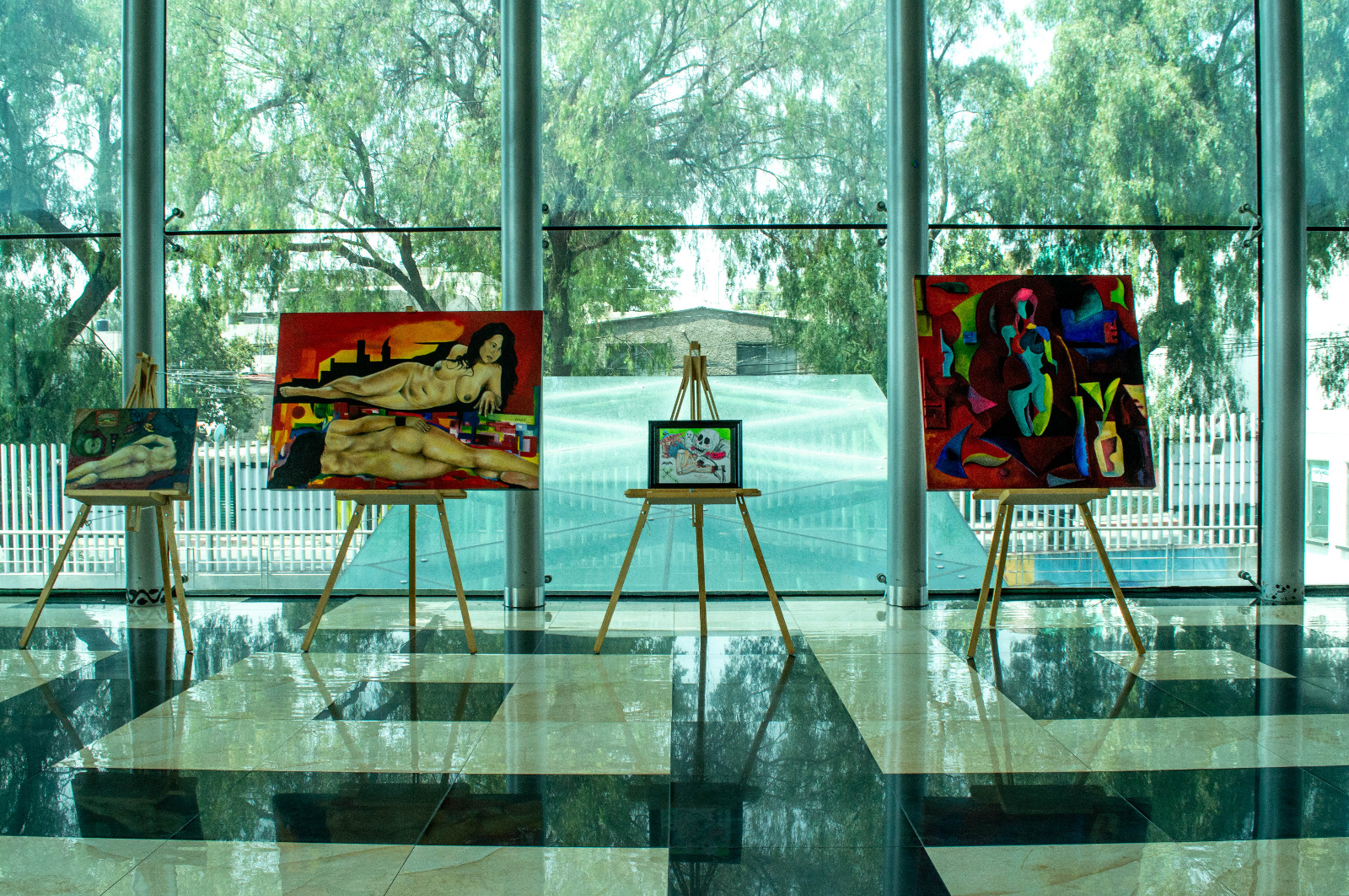 La exhibición, instalada en el lobby del teatro, aborda la temática del desnudo femenino, el surrealismo, la abstracción, la escultura en piedra y la caricatura, así como temáticas sociales y contextos actuales de la vida común.