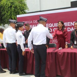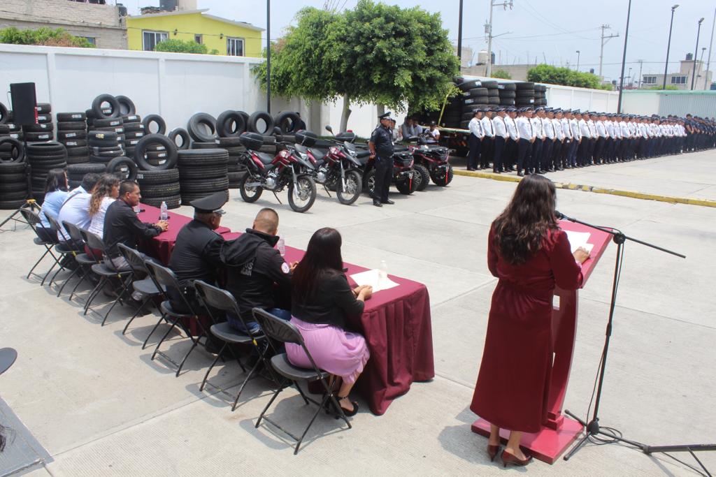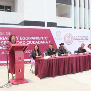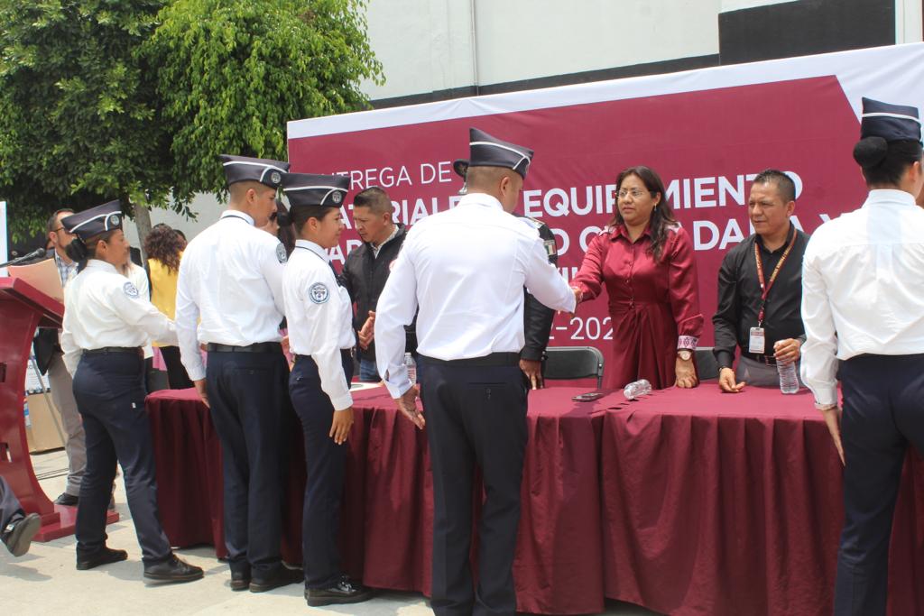 La Presidenta Municipal, Xóchitl Flores Jiménez, hizo entrega de material y equipamiento a la Dirección General de Seguridad Ciudadana y Tránsito Municipal, Protección Civil y Bomberos y para la Academia de Formación Policial, con el objetivo de continuar velando por el bienestar físico y patrimonial de las familias chimalhuaquenses.