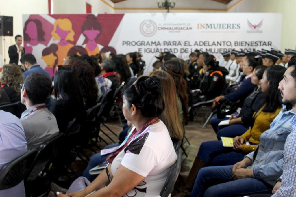 Con el objetivo de contribuir a la igualdad de oportunidades y al ejercicio de los derechos de las mujeres, mediante pláticas y talleres para el empoderamiento y fortalecimiento con perspectiva de género de los servidores públicos y población en general, el Instituto Nacional de las Mujeres (Inmujeres), en coordinación con la Dirección de la Mujer del H. Ayuntamiento de Chimalhuacán y con la organización Alas Diversas, pusieron en marcha el ciclo de talleres y pláticas del Programa Para el Adelanto, Bienestar e Igualdad de las Mujeres (PROABIM) en el municipio, a través de la impartición de la conferencia “Género y Violencias”.