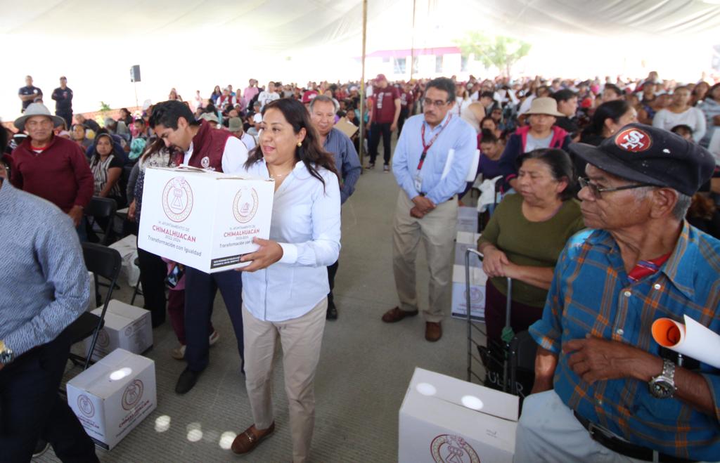 Por segundo día consecutivo, la Presidenta Municipal de Chimalhuacán, Xóchitl Flores Jiménez, encabezó la entrega de despensas a mil 469 familias congregadas en la Subestación de Seguridad Ciudadana y Protección Civil “Corte La Palma”, en el marco del Programa “Alimentación con Igualdad 2023” en su segundo reparto del año.