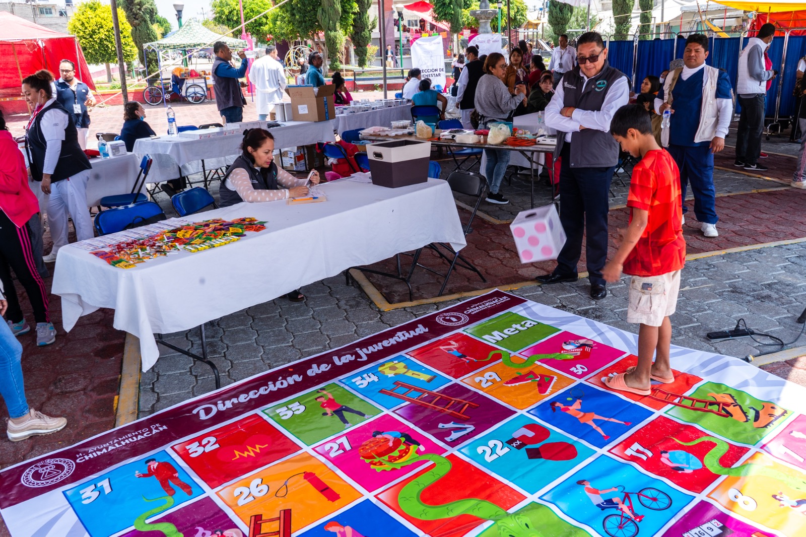 La Dirección de la Juventud, a cargo de Kelly Santiago Hernández, ofreció servicios de asesoría jurídica, de orientación y gestoría para jóvenes emprendedores y dinámicas recreativas y lúdicas, como el “Juego de Serpientes y Escaleras”, para concientizar sobre el hecho de que los buenos hábitos hacen crecer a quienes los practican y que los malos les generan retrocesos, como adicciones y enfermedades.