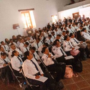 El Gobierno de Chimalhuacán, a través de la Dirección Jurídica y Consultiva y el Departamento de Capacitación, organizó la presentación de las ponencias. La segunda capacitación intitulada “El procedimiento de la queja” fue dirigida a más de 100 elementos de Seguridad Ciudadana y, de manera particular, a los cadetes de la Academia de Formación Policial de Chimalhuacán, con el objetivo de prevenir conductas que puedan ser violatorias a los derechos humanos durante el ejercicio de sus funciones.