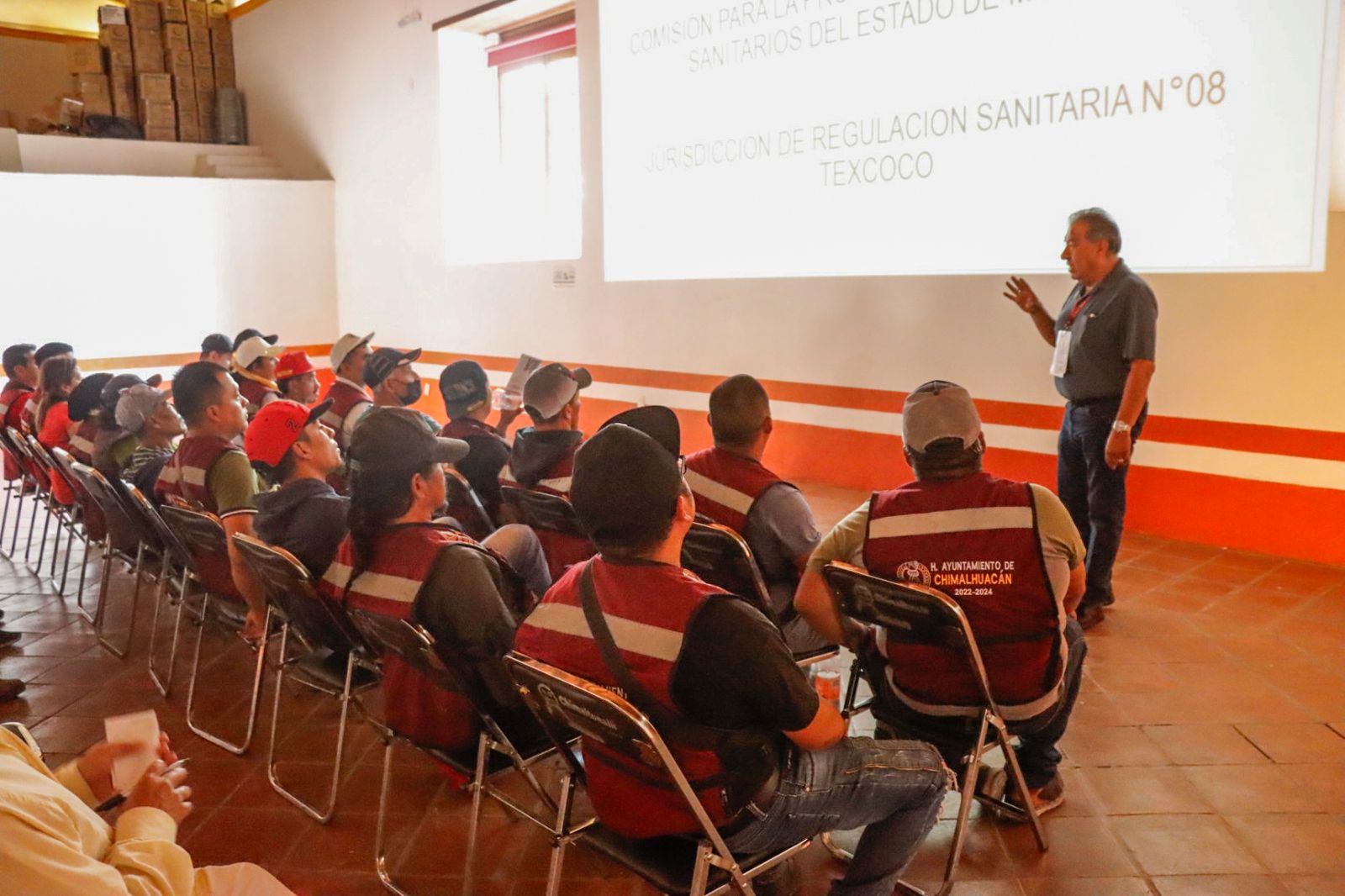 A petición de la Dirección Municipal de Servicios Públicos, brindaron la capacitación especialistas de la Dirección de Salud de Chimalhuacán, de la Jurisdicción de Regulación Sanitaria no. 8 Texcoco y de la Secretaría de Salud, el Instituto de Salud y la Comisión Para la Protección Contra Riesgos Sanitarios del Estado de México, quienes subrayaron ante los trabajadores de limpia la importancia de que usen correctamente el uniforme de trabajo y el equipo de protección.