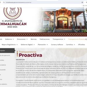 El Gobierno de Chimalhuacán, a través de la Unidad de Transparencia y Acceso a la Información Pública y de la Dirección de Educación, participa en el Certamen de Innovación en Transparencia 2024 del Instituto Nacional de Transparencia, Acceso a la Información y Protección de Datos Personales (INAI) y en la Convocatoria para el Reconocimiento de Prácticas de Transparencia Proactiva del Instituto de Transparencia, Acceso a la Información Pública y Protección de Datos Personales del Estado de México y Municipios (Infoem).