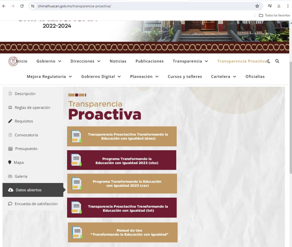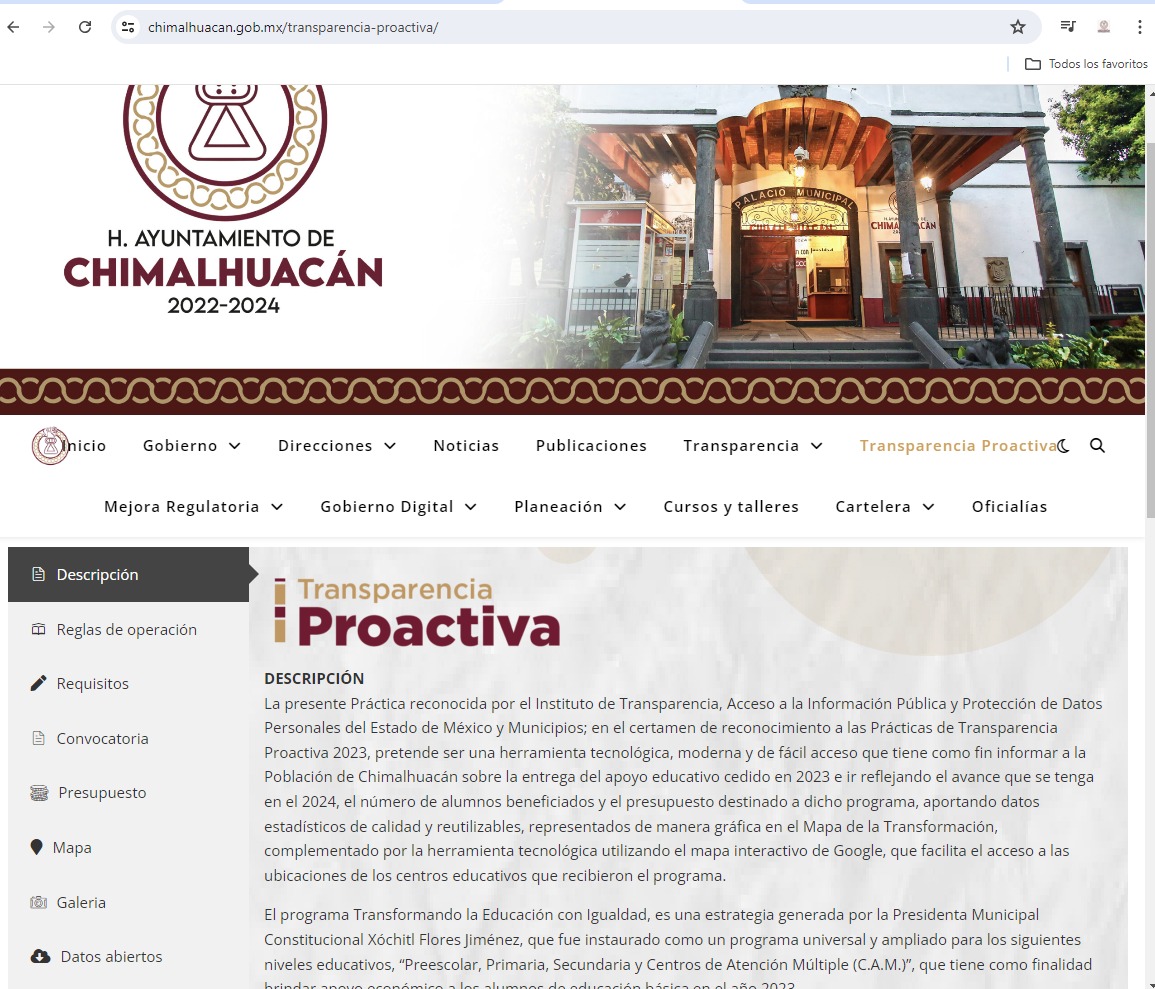 Por ello, el Gobierno de Chimalhuacán puso a disposición de la población la Herramienta de Transparencia Proactiva “Transformando la Educación con Igualdad” en su sitio web, con la cual participará en el “Certamen de Innovación de Transparencia 2024” propuesto por el INAI.