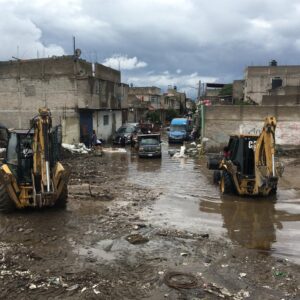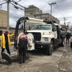 Al tiempo que se realizan trabajos para taponear las calles en la colonia Arturo Montiel, el ODAPAS está desalojando las aguas negras hacia el Dren Chimalhuacán II a través del cárcamo y bombeo de la calle Quetzalli, del Barrio Canteros, a cargo de la Comisión de Agua del Estado de México.