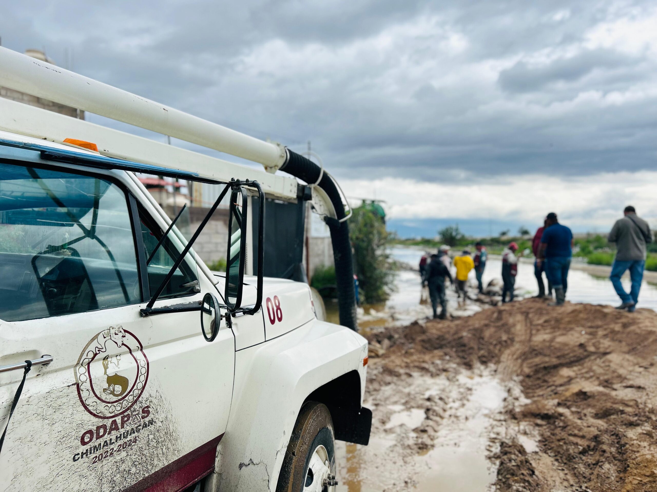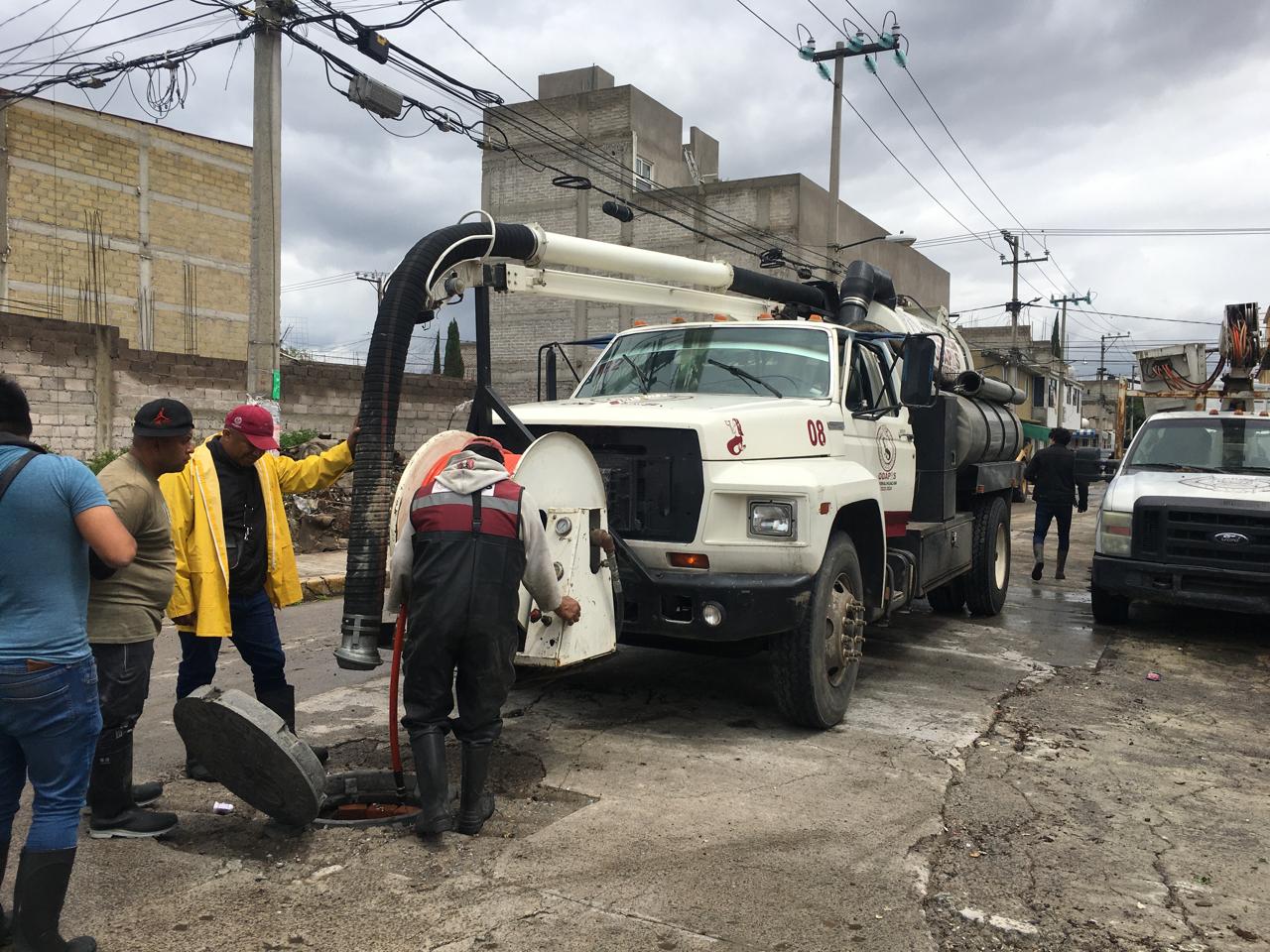 Al tiempo que se realizan trabajos para taponear las calles en la colonia Arturo Montiel, el ODAPAS está desalojando las aguas negras hacia el Dren Chimalhuacán II a través del cárcamo y bombeo de la calle Quetzalli, del Barrio Canteros, a cargo de la Comisión de Agua del Estado de México.
