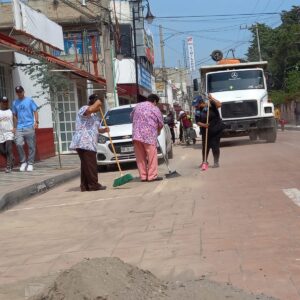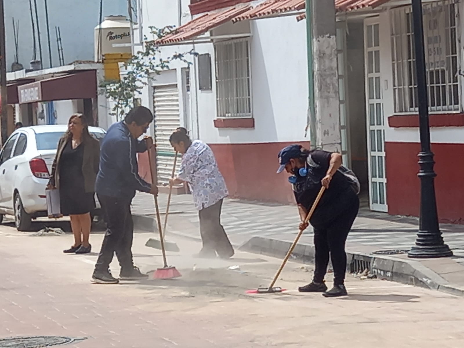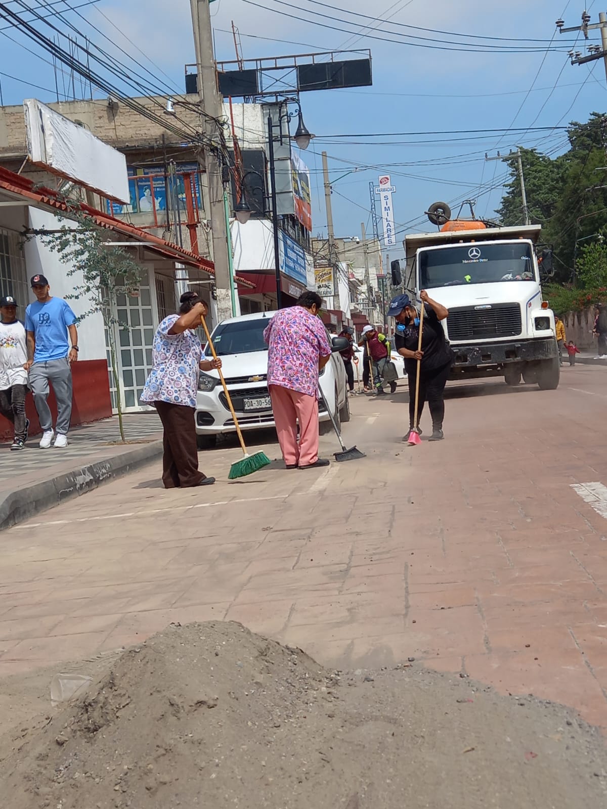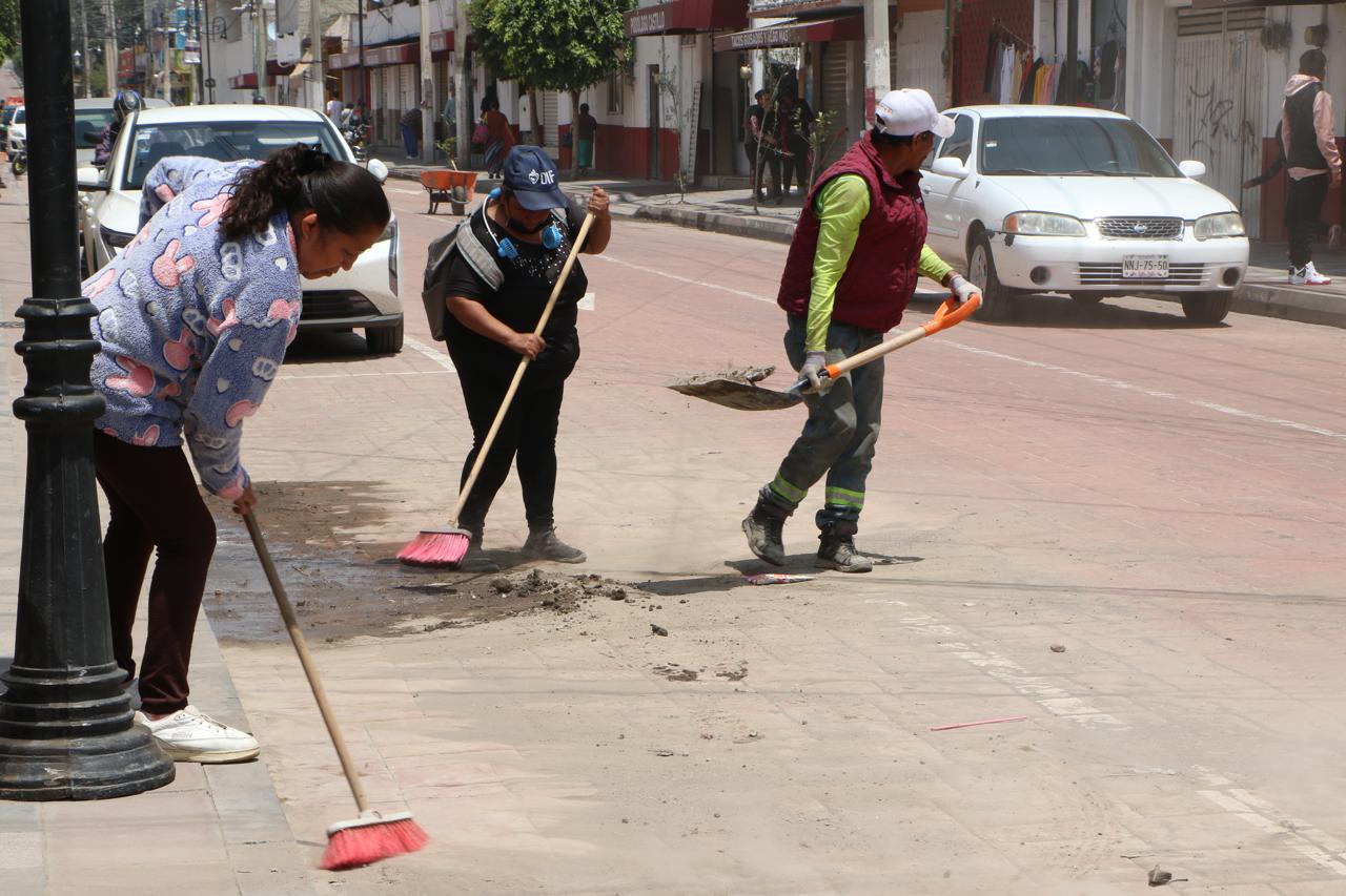 A lo largo de cerca de 400 metros, en el tramo de avenida La Paz a avenida Corregidora, la brigada de limpieza y vecinos barrieron banquetas y el arrollo vehicular para después levantar con palas y una carretilla la tierra y el escombro, dejando limpia la vialidad.