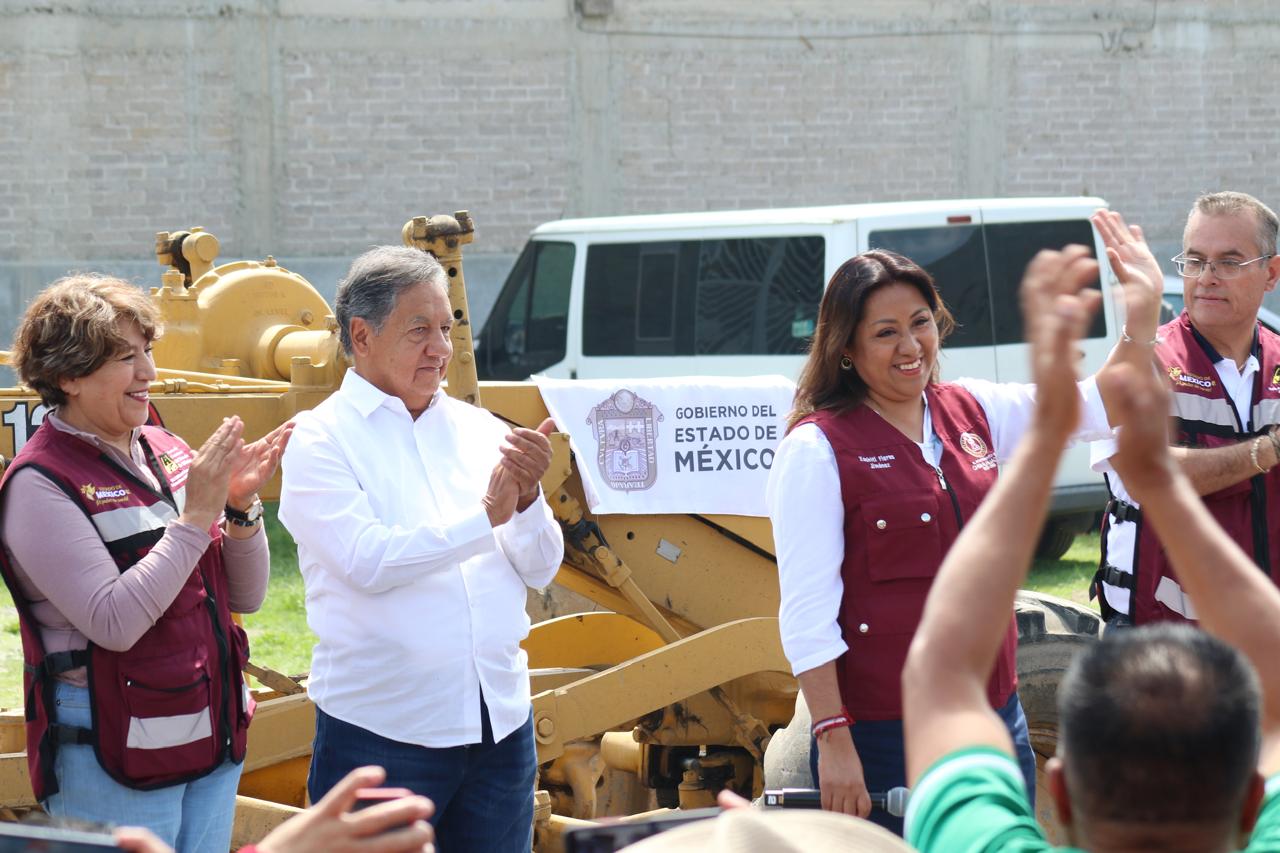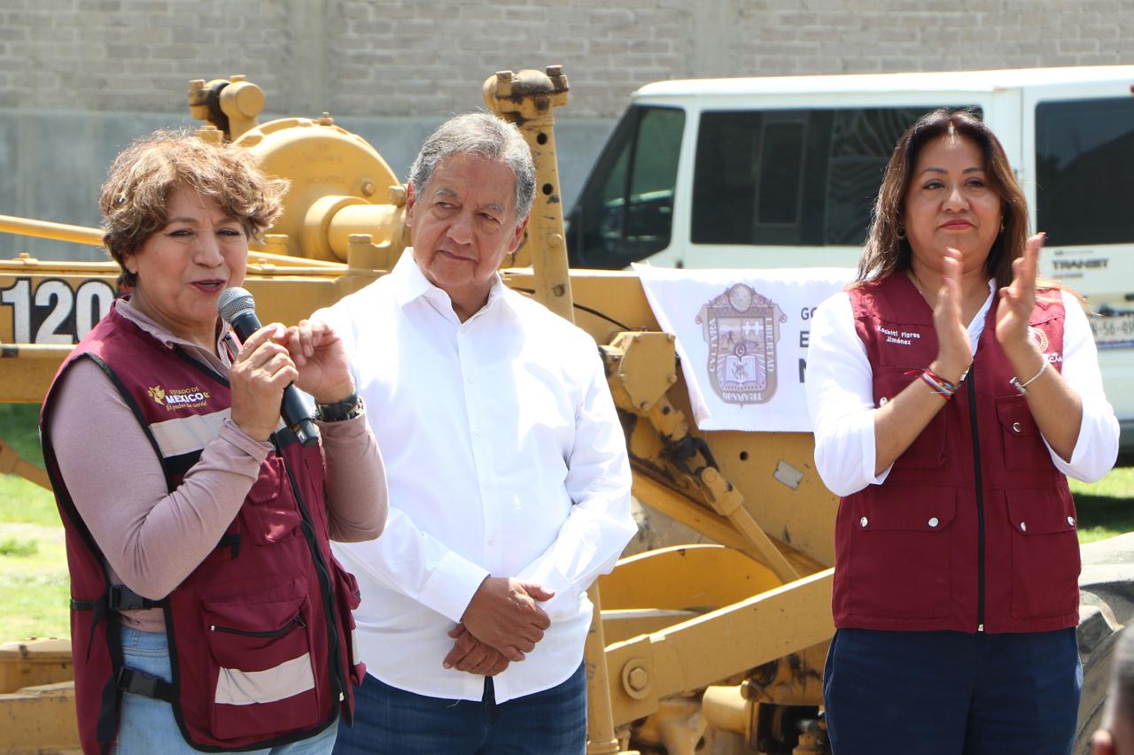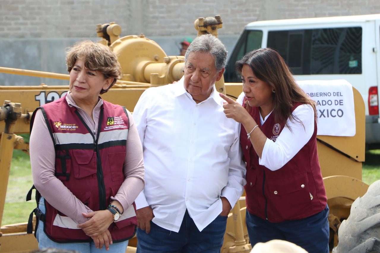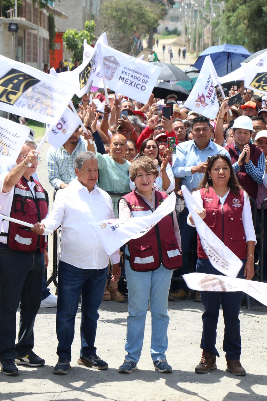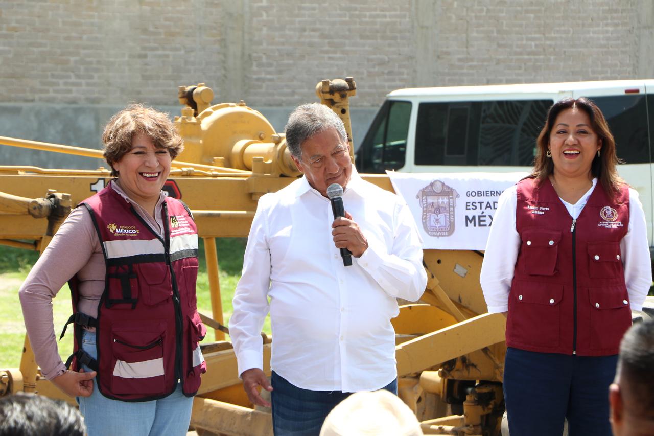 La Gobernadora del Estado de México, la maestra Delfina Gómez Álvarez, acompañada de la Presidenta Municipal de Chimalhuacán, Xóchitl Flores Jiménez, y de otros servidores públicos de la entidad, dio el banderazo de inicio de la obra de construcción de pavimento hidráulico, guarniciones y banquetas de la calle “De la Hacienda” en la colonia Loma de Buenavista, en Ejidos de Santa María. Y anunció que el Gobierno del Estado realizará dos obras más en el municipio: el mejoramiento del Deportivo Herreros, ubicado en el barrio Herreros, y la construcción del puente “Los Rosales” en el Canal Río de la Compañía, a la altura de las Avenidas José López Portillo y Prolongación Chimalhuacán, el cual conecta con Nezahualcóyotl.