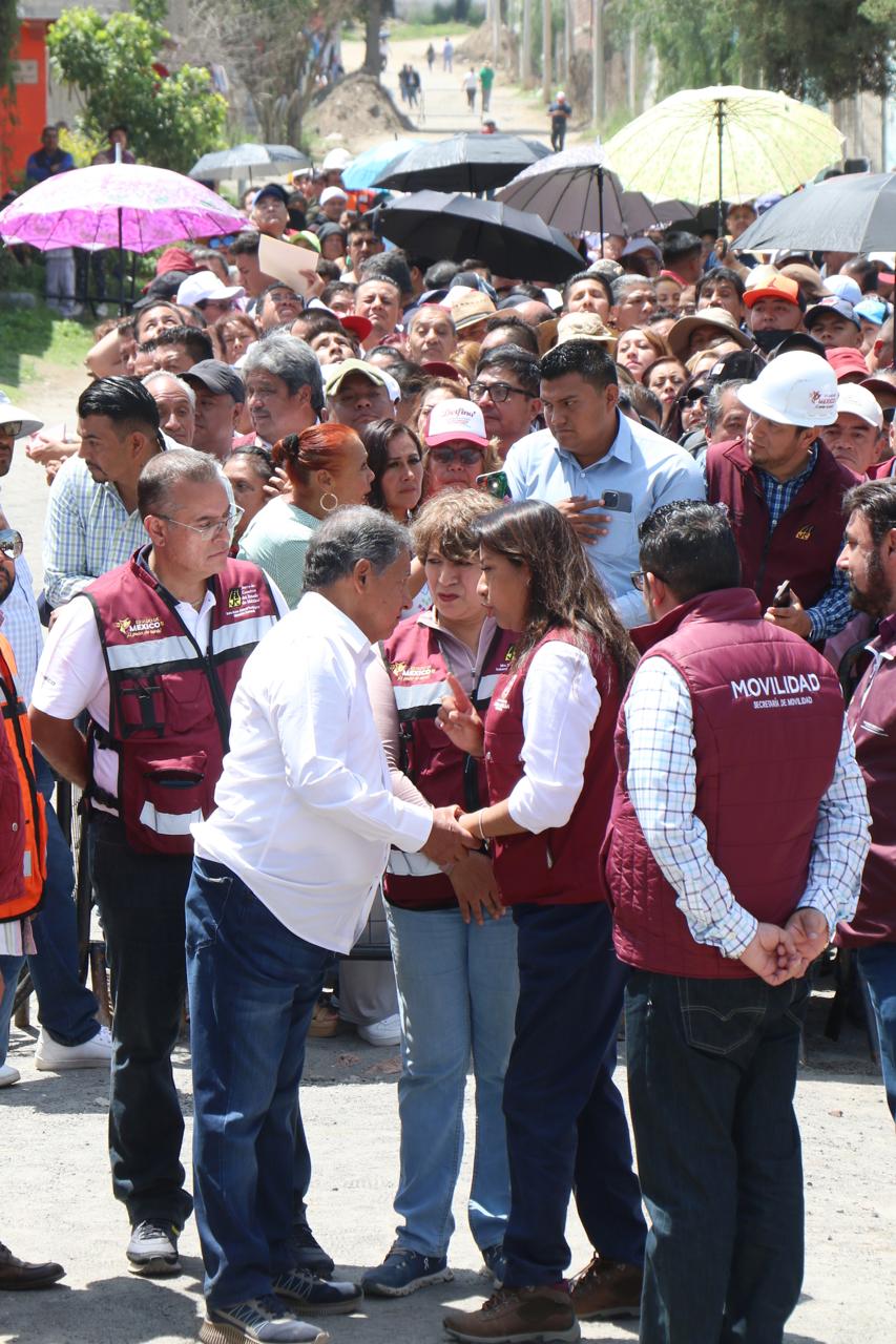 La maestra Gómez Álvarez agradeció la anfitrionía de la Presidenta Xóchitl Flores e informó que la obra de Construcción de la Calle “De la Hacienda” estará a cargo de la Junta de Caminos del Estado de México, la cual consta de la construcción de 4 mil 582 m2 de carpeta con losa de concreto hidráulico que impactará positivamente la vida de 11 mil 619 habitantes.