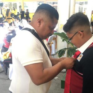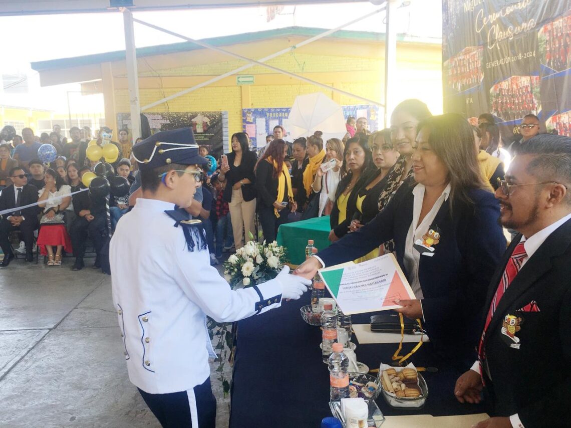 La Presidenta Xóchitl Flores Jiménez también entregó reconocimientos y medallas a los integrantes de la escolta saliente, quienes en un acto protocolario entregaron el lábaro patrio a la nueva escolta. Asimismo, acompañada del Supervisor Escolar de la Zona P-203, Dr. Rodrigo Rojas Díaz; de la Subdirectora Escolar, Catalina Cruz Morelos; del Secretario Escolar, Víctor Manuel Lozano; de la Directora Municipal de Educación, María del Pilar Piña Trejo; y de las maestras de los grupos de sexto grado, entregó diplomas a los graduados, a quienes les obsequió un pastel.