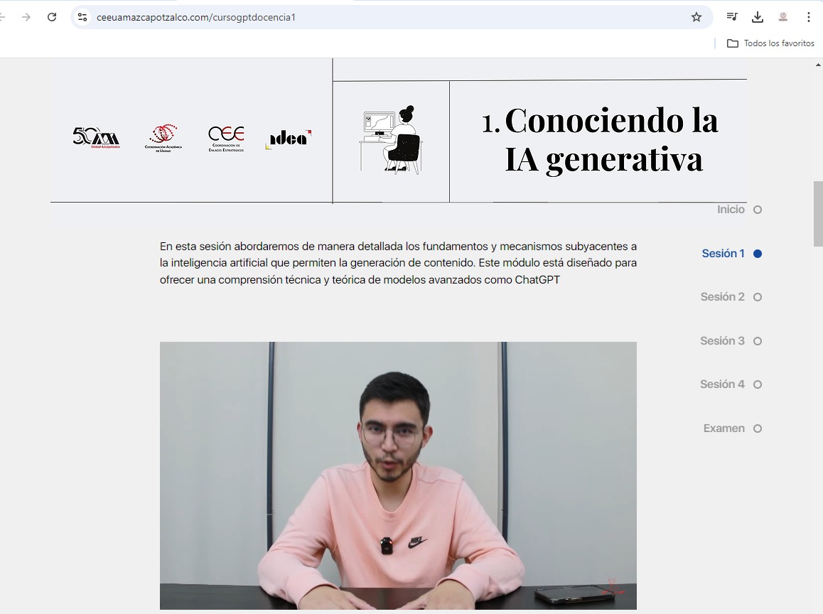 Indicó que el curso se desarrollará en 4 sesiones: la primera y la segunda abordarán la parte teórica y la estructura, mientras que en las sesiones 3era. y 4ta. se tratará la parte práctica, y se podrá tomar un módulo por semana o dos o más en un día, de acuerdo a las posibilidades del docente. Al finalizar el curso, se aplicará un examen y se otorgará una constancia por la UAM Azcapotzalco.