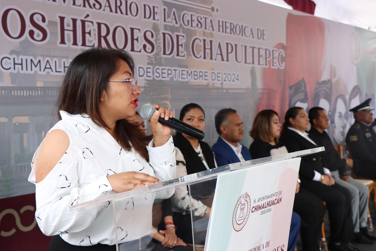 Durante la ceremonia por el CLXXVII Aniversario de aquella Gesta Heroica, la Secretaria del H. Ayuntamiento de Chimalhuacán expresó que los nombres de los Niños Héroes (Agustín Melgar, Francisco Márquez, Fernando Montes de Oca, Juan de la Barrera, Vicente Suárez y Juan Escutia) quedaron grabados en la historia de México como sinónimos de valor y patriotismo. “La historia nos cuenta que estos jóvenes, con edades entre los 13 y 19 años, enfrentaron al enemigo con una determinación y un valor que han dejado huella imborrable en la memoria colectiva de México”, expresó la Secretaria del Ayuntamiento.
