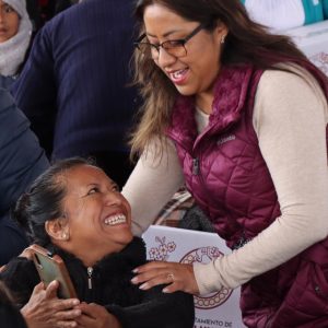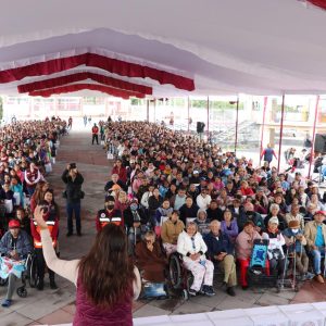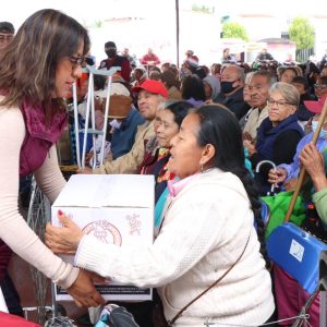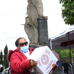 En la Plaza Cívica Benito Juárez, del Barrio Vidrieros y donde hoy culminó la tercera entrega de 12 mil despensas, la Alcaldesa Flores Jiménez aseguró que el trabajo del Ejecutivo Federal se ve con la llegada de los programas que ahora son ley, como la apoyos a los adultos mayores, a personas con discapacidad, al campo mexicano, a jóvenes y estudiantes.