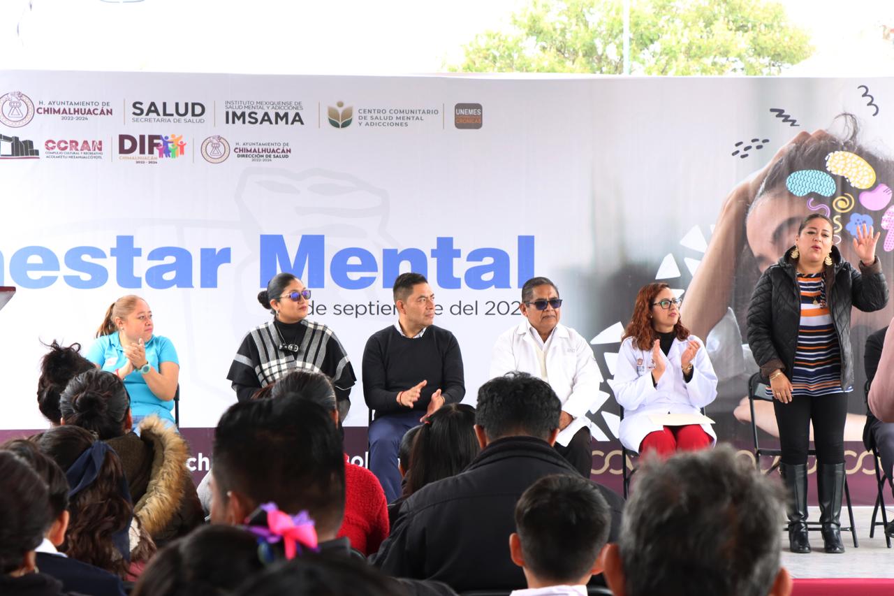 Con el propósito de fomentar el acceso al derecho humano a la salud mental, el Gobierno del Estado de México, a través del Instituto de Salud del Estado de México (ISEM), de la Unidad de Especialidad en Salud Mental Centro Comunitario de Salud Mental y Adicciones (UNEME-CECOSAMA), de UNEME-SORID, del Centro Integral de Salud Mental (CISAME), de la Jurisdicción Sanitaria Texcoco, y en coordinación con el H, Ayuntamiento de Chimalhuacán, realizaron la “Primera Feria del Bienestar Mental” en el municipio.