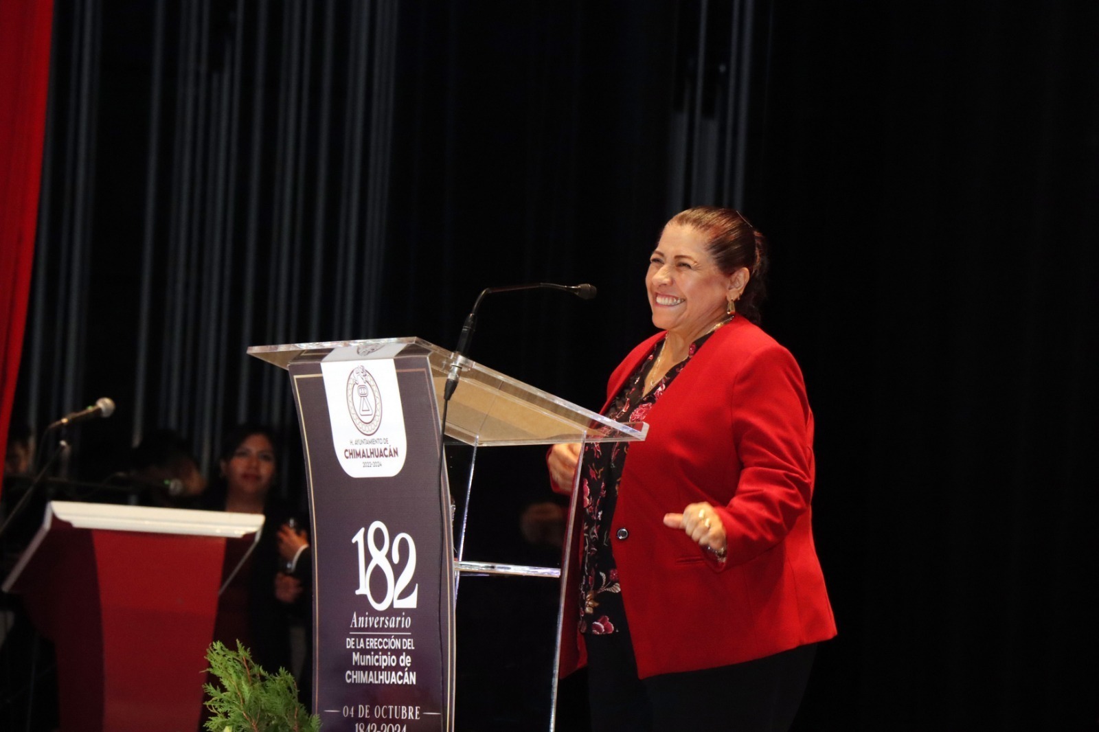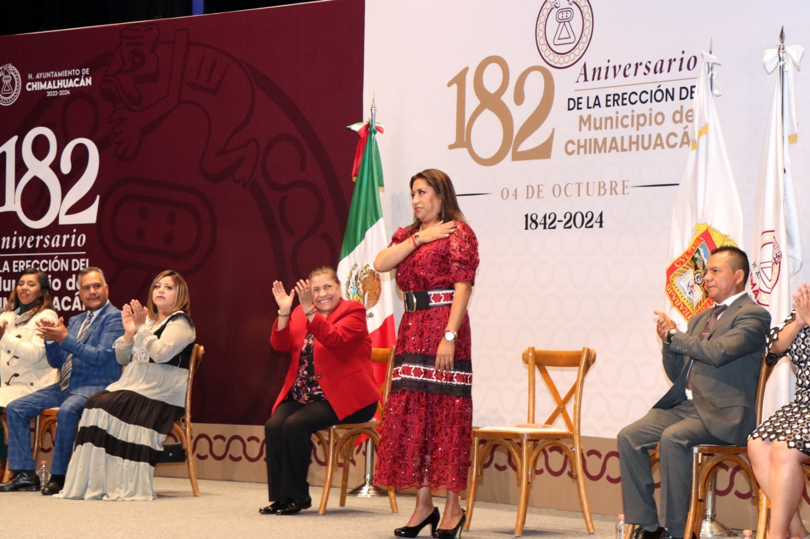En representación de la Gobernadora del Estado de México, Delfina Gómez Álvarez, la Maestra Elvira Marín Sánchez, Subdirectora Regional de Educación Básica, destacó la importancia histórica de Chimalhuacán al celebrar el 182 aniversario de su erección. Señaló que es un municipio “resiliente de gente trabajadora, cuya historia habla del desarrollo y crecimiento, de corazón de amor a la patria y al trabajo.”