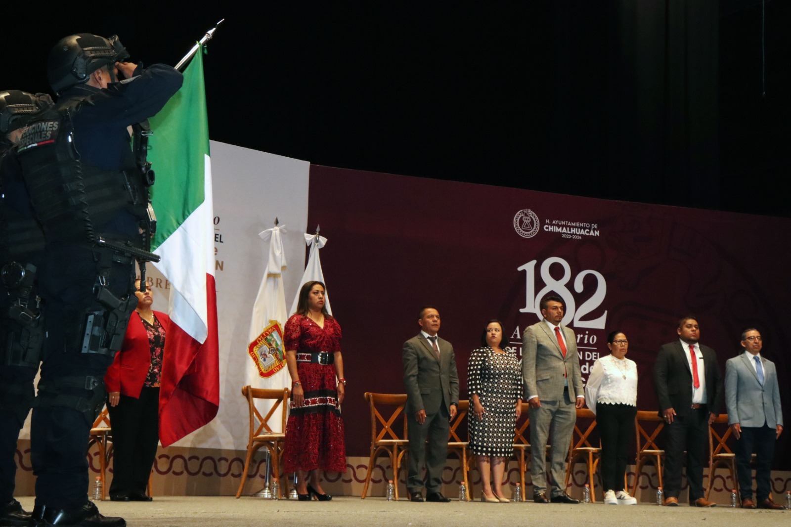 En la ceremonia del 182 Aniversario de la Erección del municipio de Chimalhuacán, en la que se rindieron honores al lábaro patrio con la participación de la Banda de Guerra y Escolta de la Dirección de Seguridad Pública y Tránsito Municipal, estuvieron presentes la Senadora Sandra Luz Falcón Venegas; el Jefe de Departamento de Educación Secundaria General en el Valle de México, Adrián Figueroa Arrieta; los presidentes municipales electos de Nicolas Romero, La Paz, Chicoloapan y Juchitepec, así como diputados federales y locales y servidores públicos de los gobiernos del Estado de México y de Chimalhuacán.