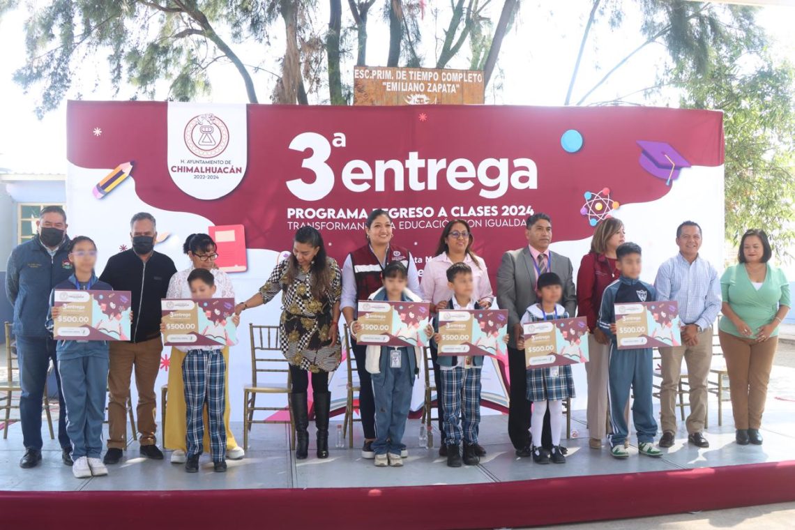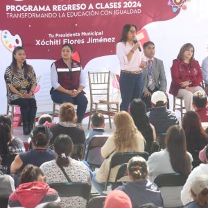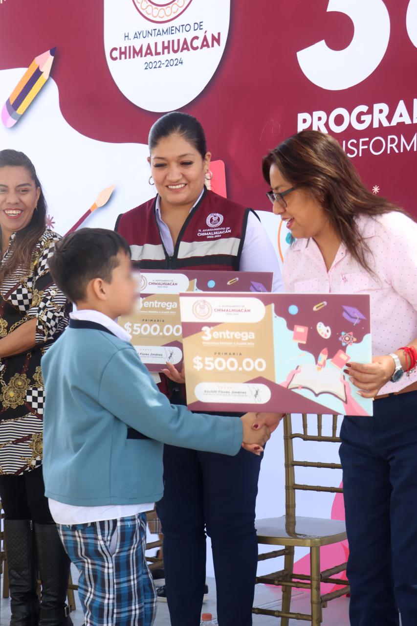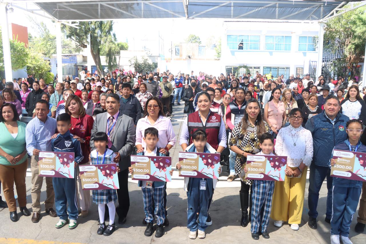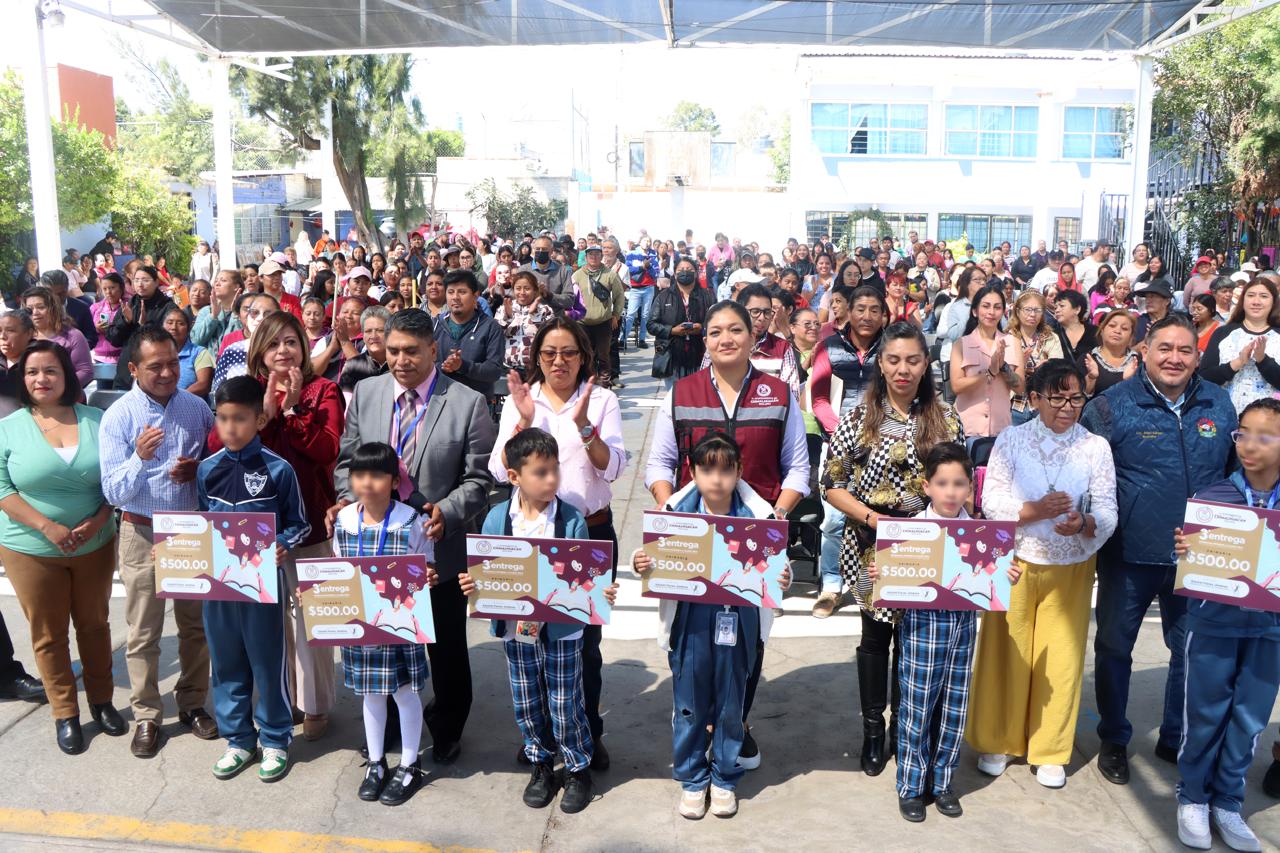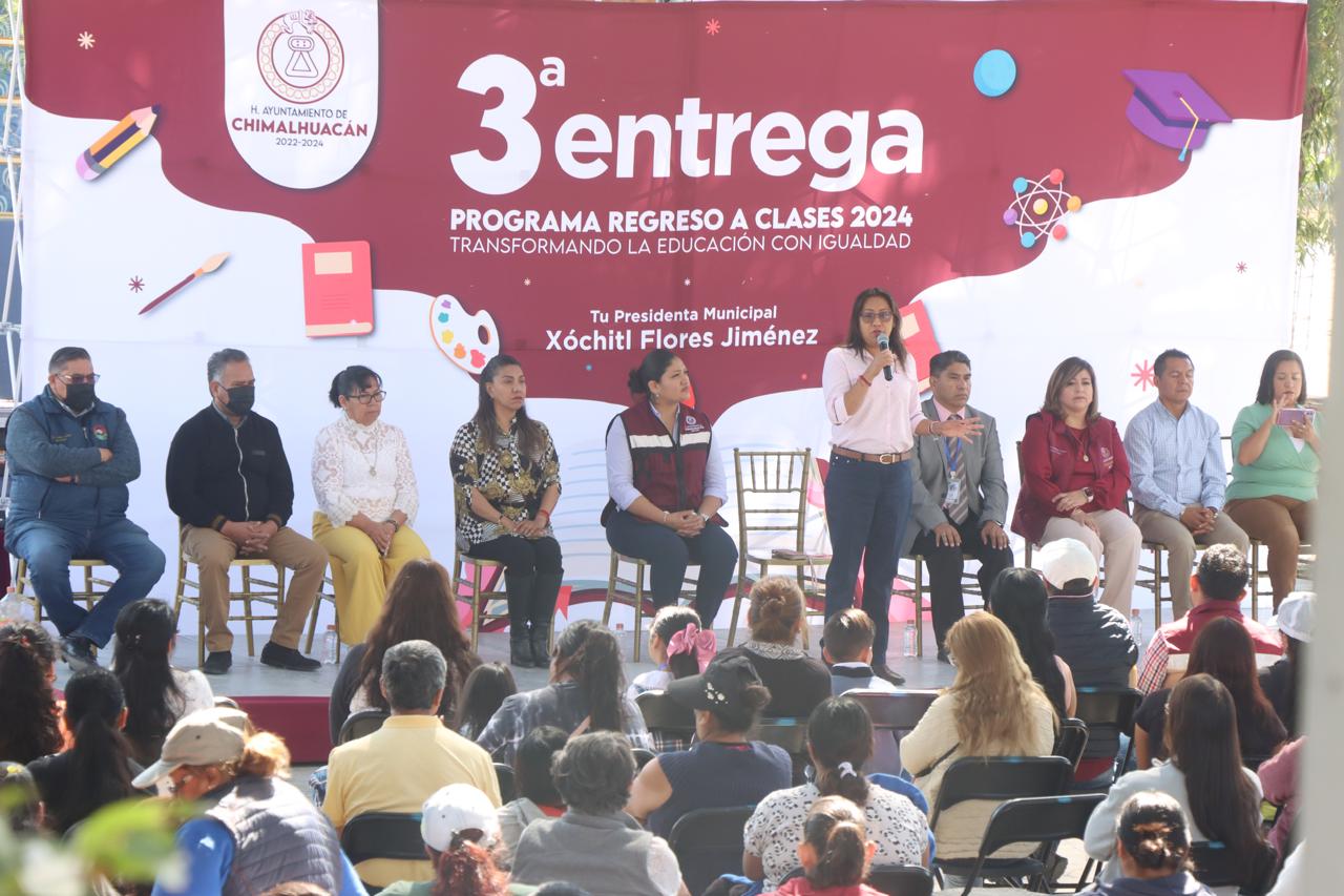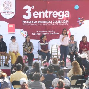 La Presidenta Municipal de Chimalhuacán, Xóchitl Flores Jiménez, entregó más de 340 apoyos económicos del programa municipal “Regreso a Clases, Transformando la Educación con Igualdad” a alumnos y padres de familia de la Escuela Primaria “Emiliano Zapata”, ubicada en la colonia Santa María Nativitas, con la finalidad de apoyar a los tutores con los gastos generados por el inicio del ciclo escolar.