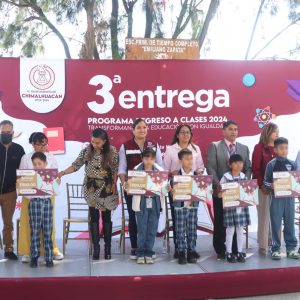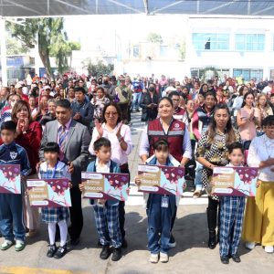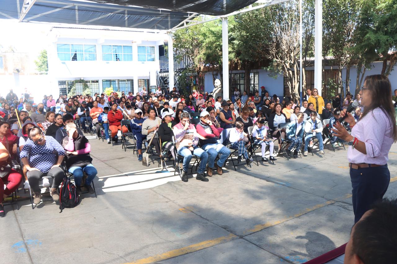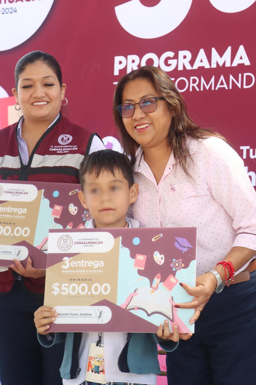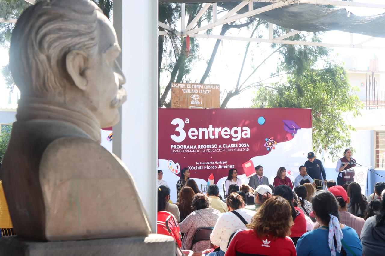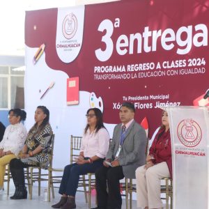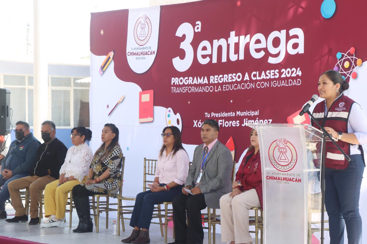 La Presidenta Municipal de Chimalhuacán, Xóchitl Flores Jiménez, entregó más de 340 apoyos económicos del programa municipal “Regreso a Clases, Transformando la Educación con Igualdad” a alumnos y padres de familia de la Escuela Primaria “Emiliano Zapata”, ubicada en la colonia Santa María Nativitas, con la finalidad de apoyar a los tutores con los gastos generados por el inicio del ciclo escolar.