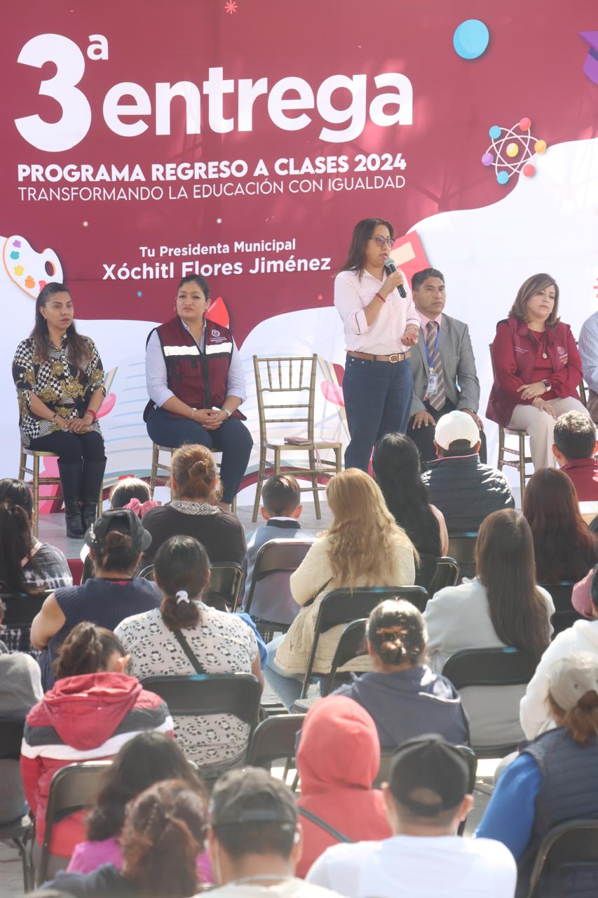 Respecto al programa municipal “Regreso a clases, Transformando la Educación con Igualdad”, la Presidenta de Chimalhuacán expresó su comprensión con los padres y madres de familia, quienes realizan gastos significativos en la educación de sus hijos, más aún cuando cambian de nivel de estudios (de preescolar a primaria o de primaria a secundaria), pues tienen que comprar nuevos uniformes. “Vimos esas necesidades y fue que creamos este programa que recibirán en efectivo. Sabemos que ir a una tienda de autoservicio es más caro, entonces con el dinero en efectivo pueden ir donde sea más económico para adquirir los útiles que les hagan falta”, expresó.