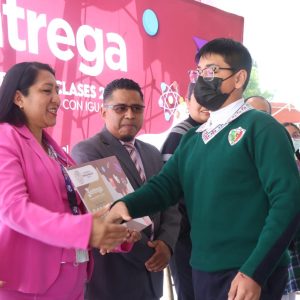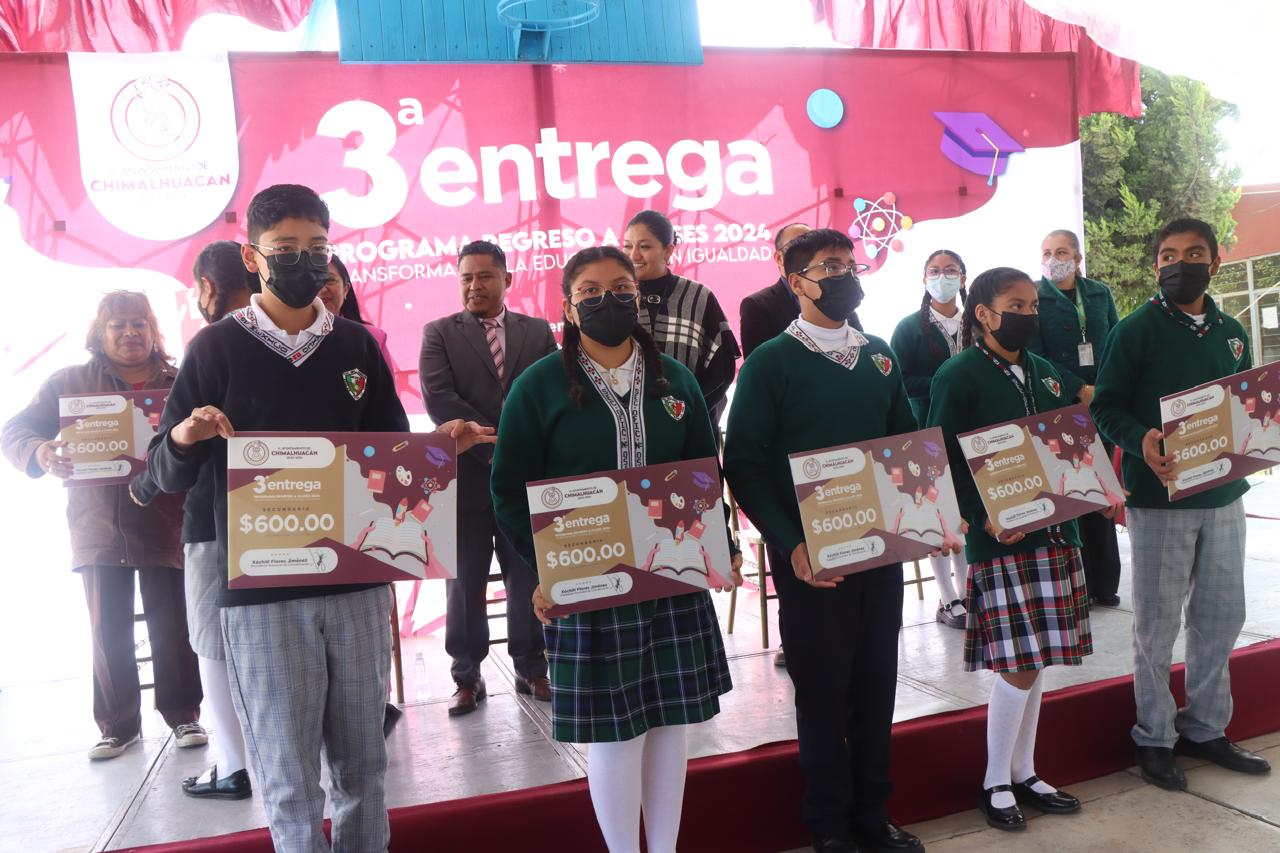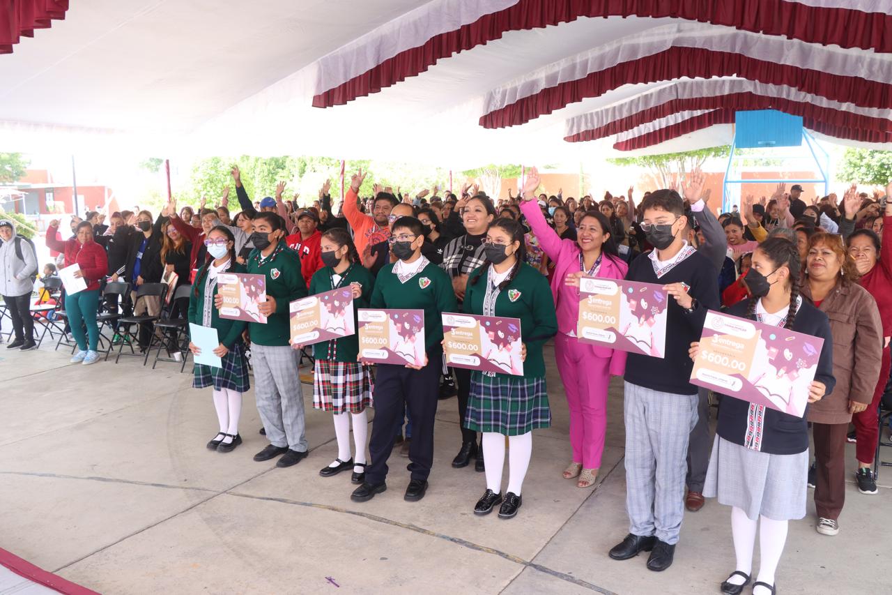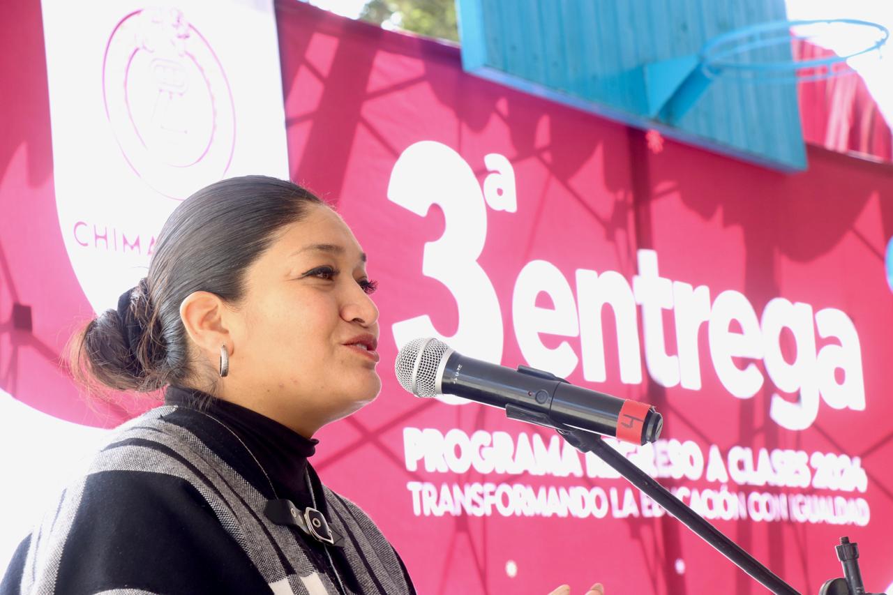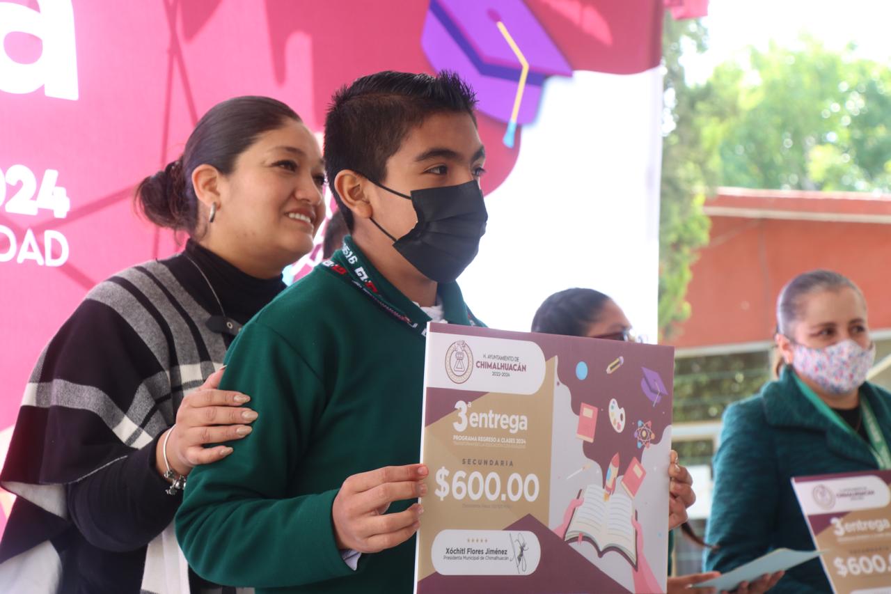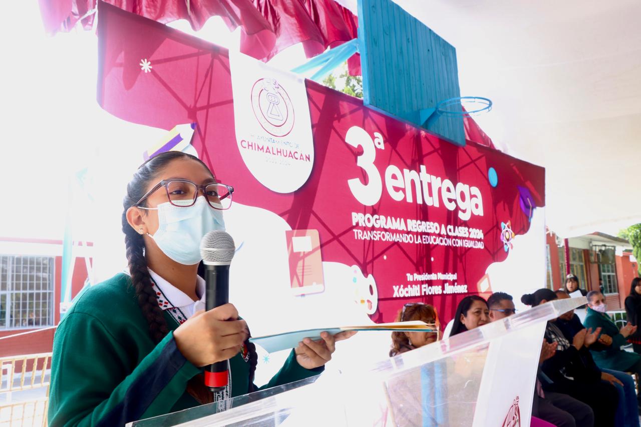 La Directora de Educación del H. Ayuntamiento de Chimalhuacán, María del Pilar Piña Trejo, en representación de la Presidenta Xóchitl Flores Jiménez, entregó más de 500 apoyos económicos del programa municipal “Regreso a Clases, Transformando la Educación con Igualdad” en la Escuela Secundaria General No. 0516 “México”, ubicada en el Barrio Transportistas, y anunció la construcción de un arcotecho en el área de impartición de educación física de este plantel.