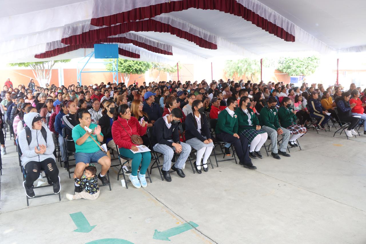 “Hoy les traemos otra muy buena noticia que la Presidenta Xóchitl Flores nos pidió comunicarles: el Gobierno Municipal construirá un arcotecho en esta escuela”, anunció la maestra Piña Trejo, lo cual agradecieron entre aplausos y porras los padres, madres de familia y tutores de la Secundaria “México”.