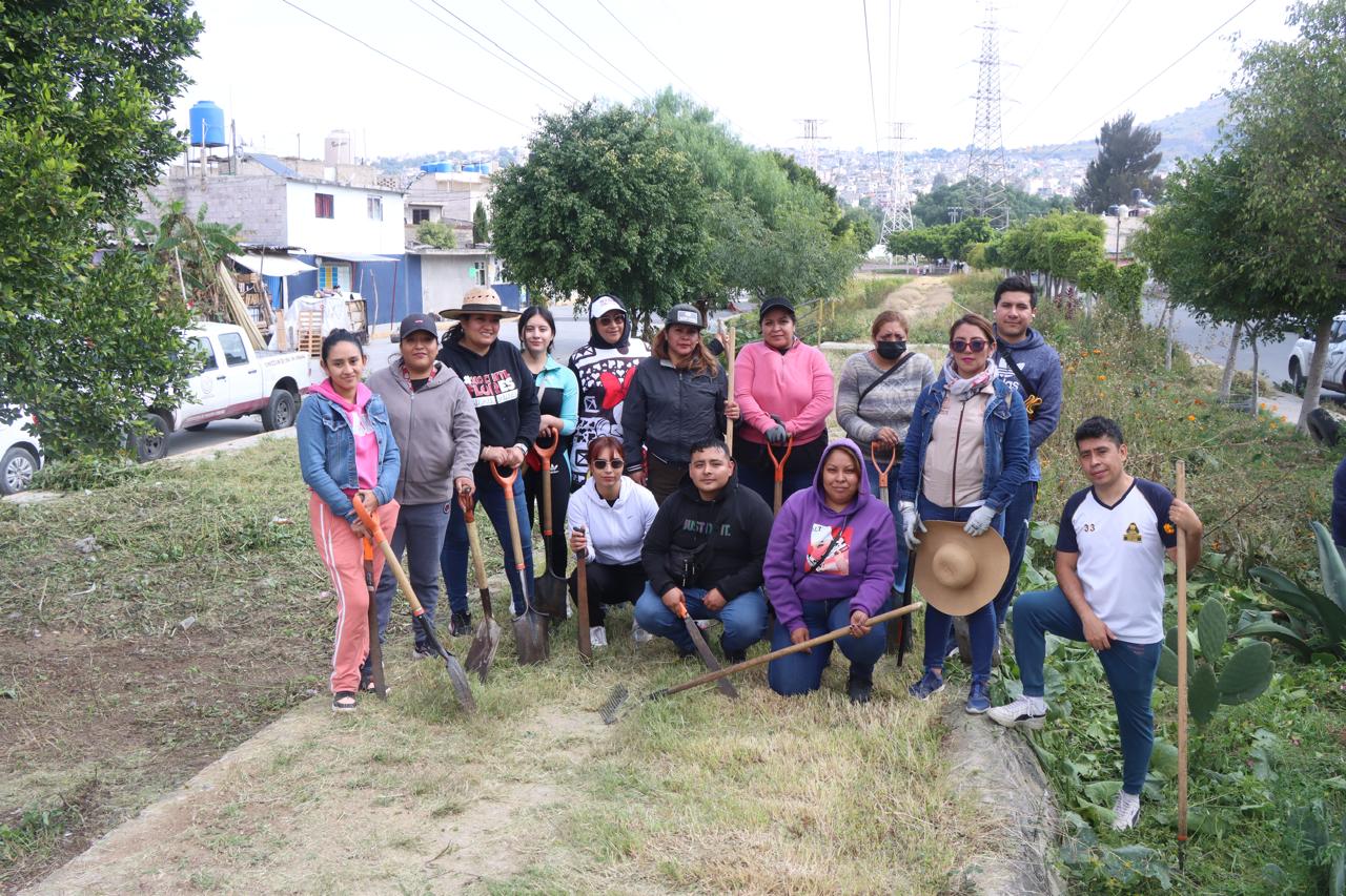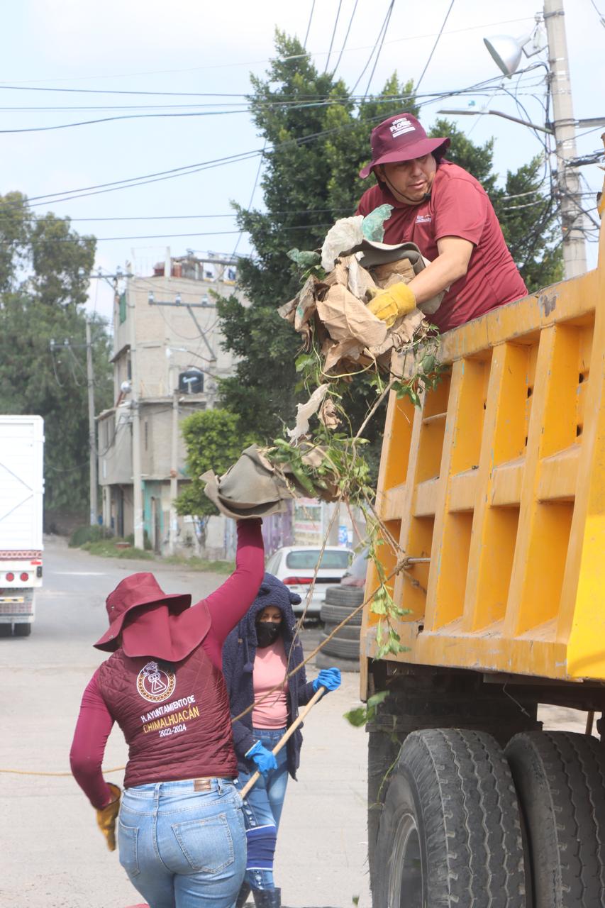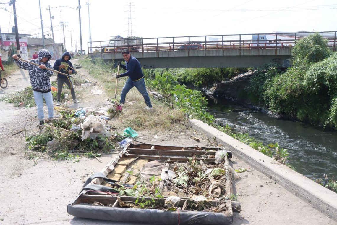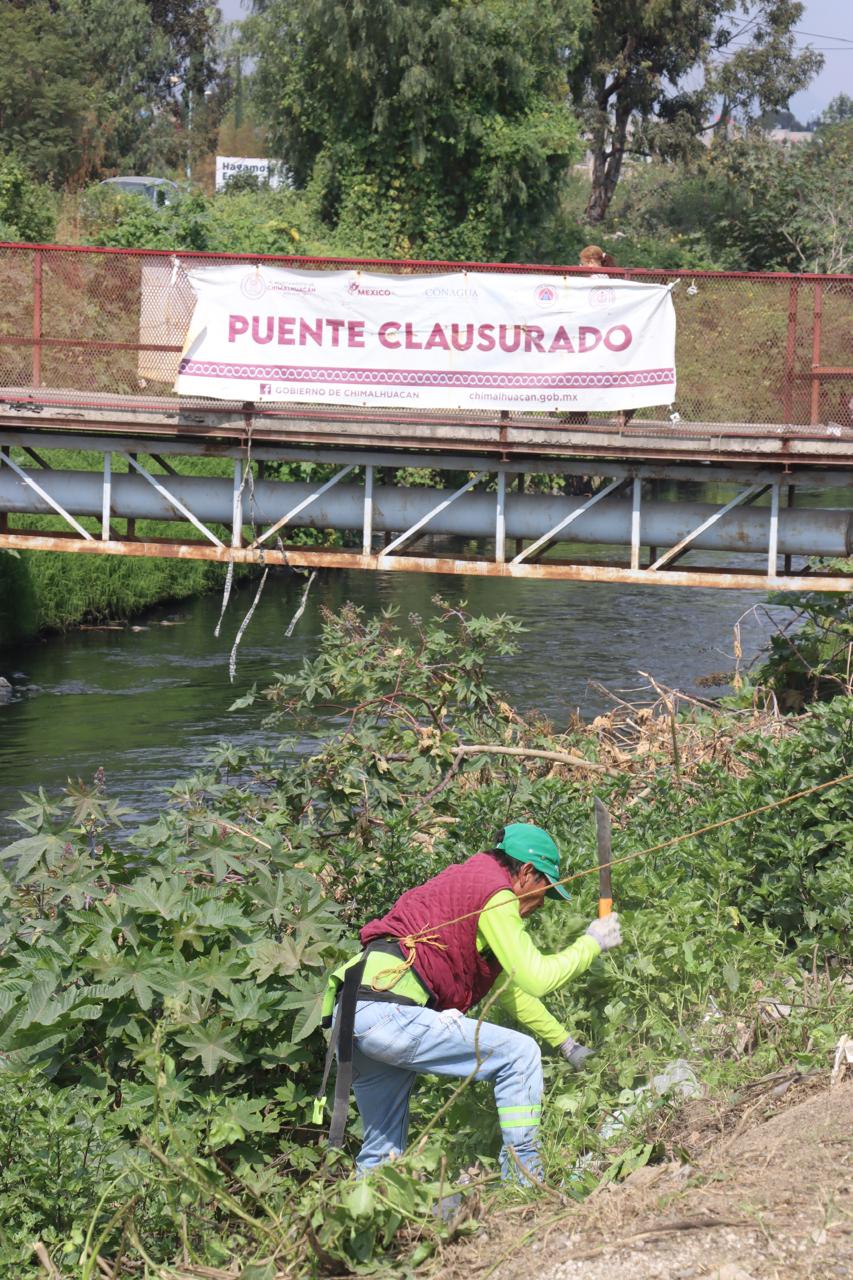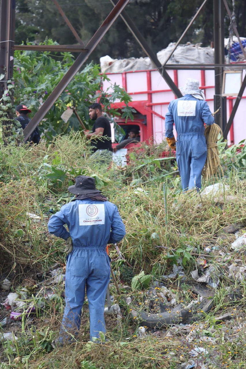 Con la finalidad de contribuir a la generación de espacios públicos limpios en beneficio de la comunidad e incrementar la seguridad en el territorio, servidores públicos del H. Ayuntamiento de Chimalhuacán, instruidos por la Presidenta Municipal, Xóchitl Flores Jiménez, realizaron una Jornada Sabatina de Limpieza a la altura del Puente Jacarandas, ubicado en el barrio San Lorenzo.
