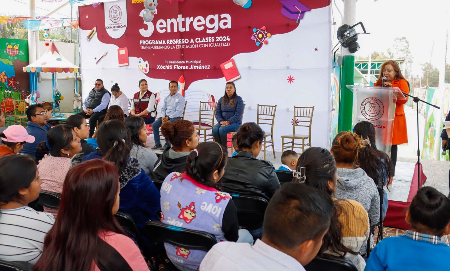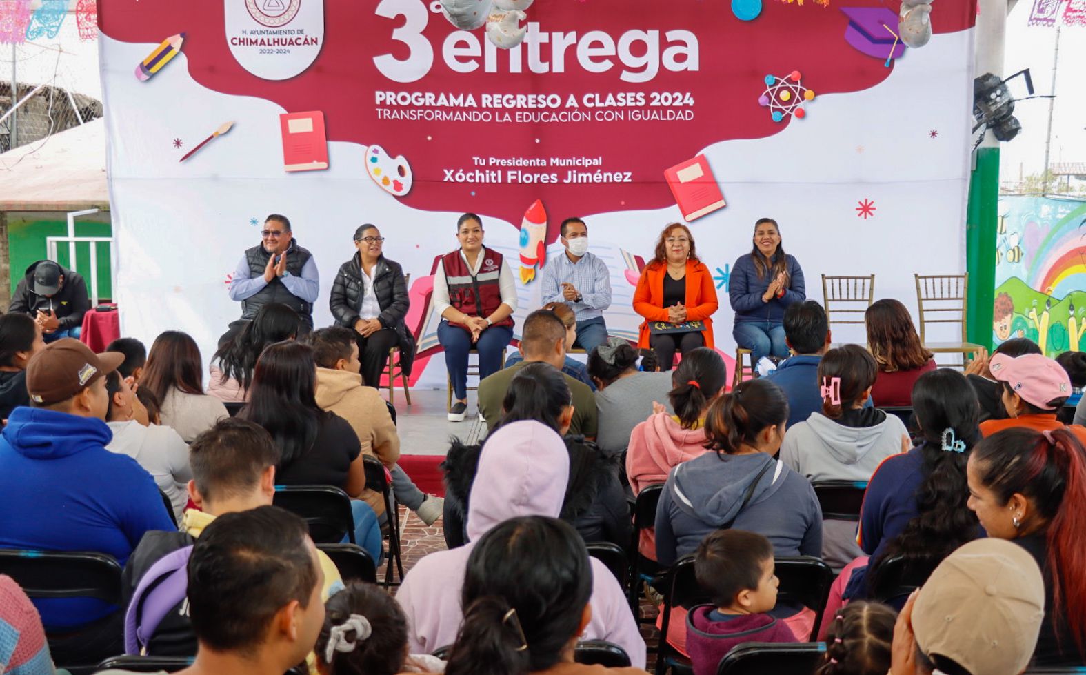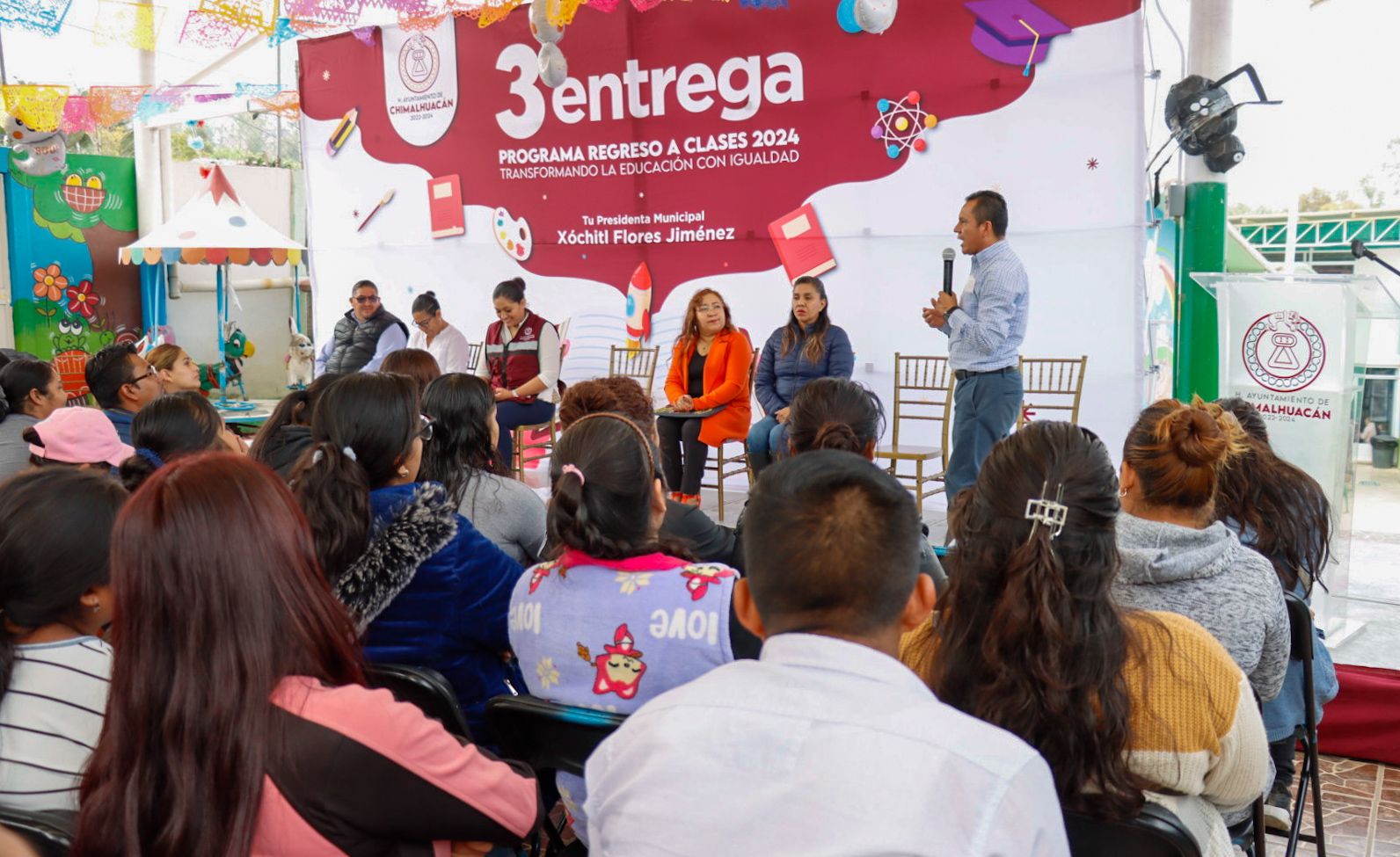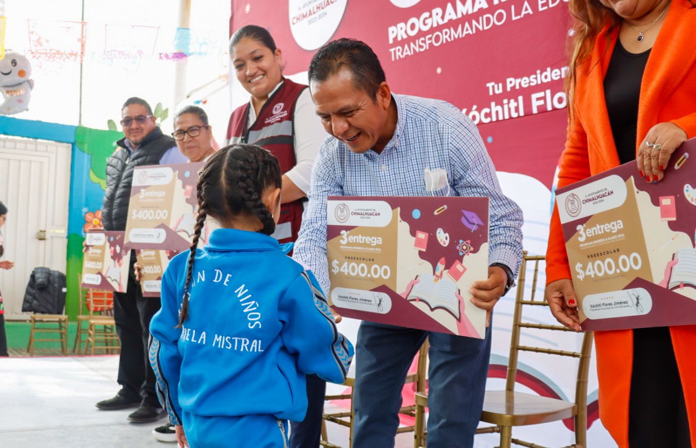 El gobierno de Chimalhuacán, encabezado por la Presidenta Xóchitl Flores Jiménez, llevó a cabo la clausura del programa “Regreso a Clases, Transformando la Educación con Igualdad 2024” en el preescolar “Gabriela Mistral” de Ejidos Santa María, donde se entregó el apoyo económico a 223 niños de ambos turnos.