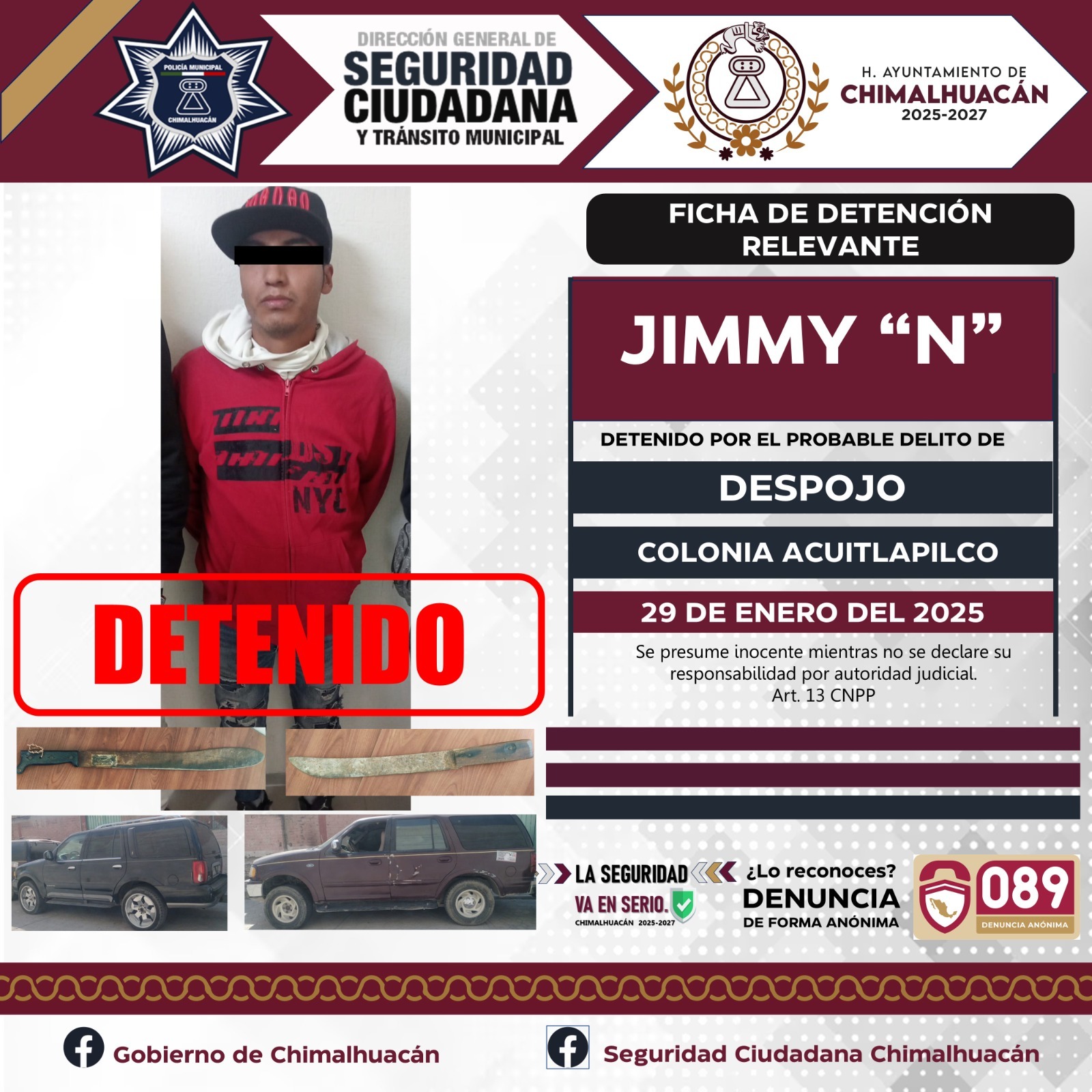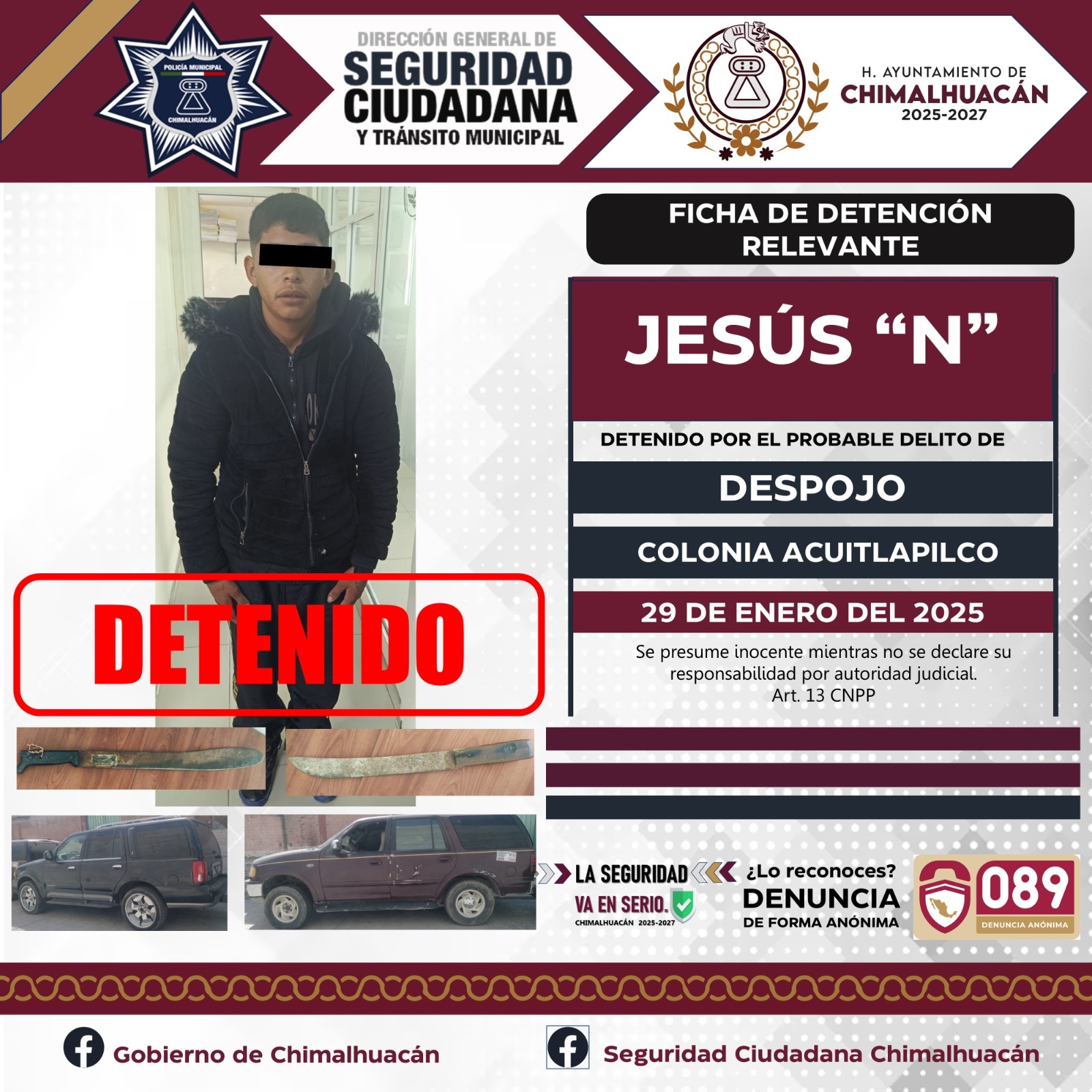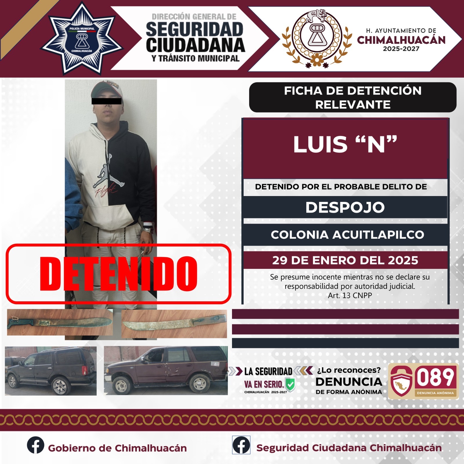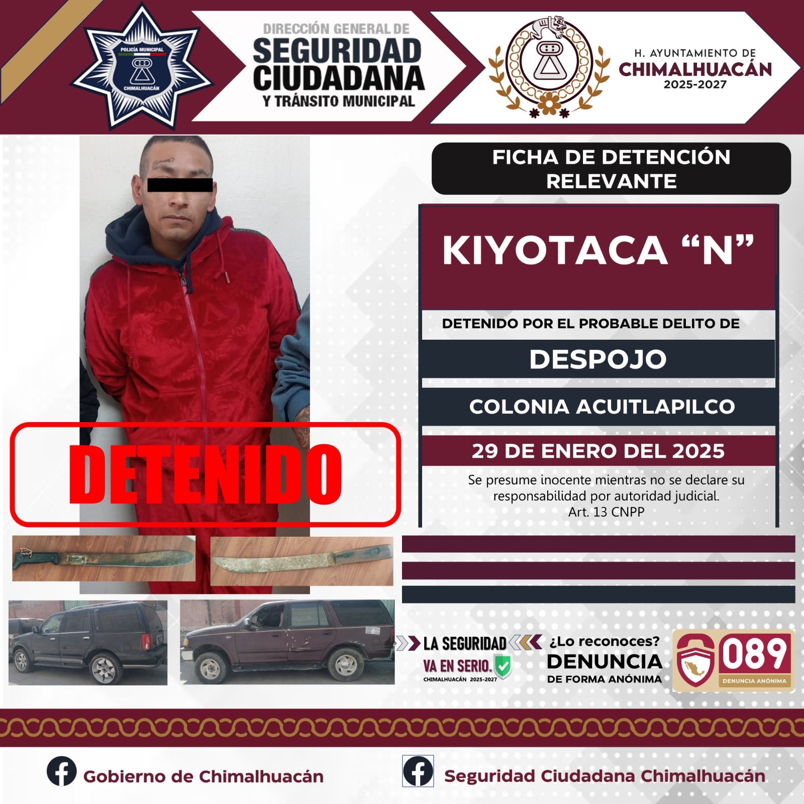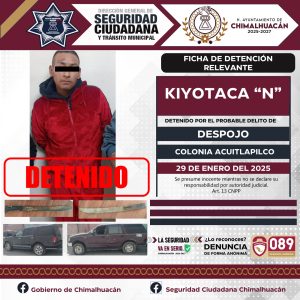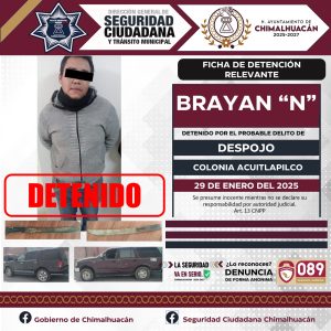 El pasado 28 de enero del 2025 mientras se llevaba a cabo un dispositivo en la colonia Acuitlapilco. Elementos operativos de la Policía Municipal, elementos de la Secretaría de Seguridad del Estado de México (SSEM) y la Fiscalía del Estado de México, fueron informados de parte de uno de nuestros ciudadanos quien mencionaba que se encontraba al interior de su domicilio cuando ingresó un grupo de personas para sacarlo de su propiedad, y es como gracias a la pronta actuación de los elementos se logra la detención de este grupo de 11 personas quienes dijeron llamarse Brayan “N”, Sandra “N”, Israel “N”, Blanca “N”, Luis “N”, Evelyn “N”, Maricela “N”, Kiyotaka “N”, Alejo “N”,Jimmy “N” y Brayan Jesús “N” mismos que se les da de conocimiento del motivo de su detención y se les informa de sus derechos que la ley les consagra fueron puestos a disposición ante la fiscalía general de justicia misma que se encargaba de definir su situación jurídica y legal.