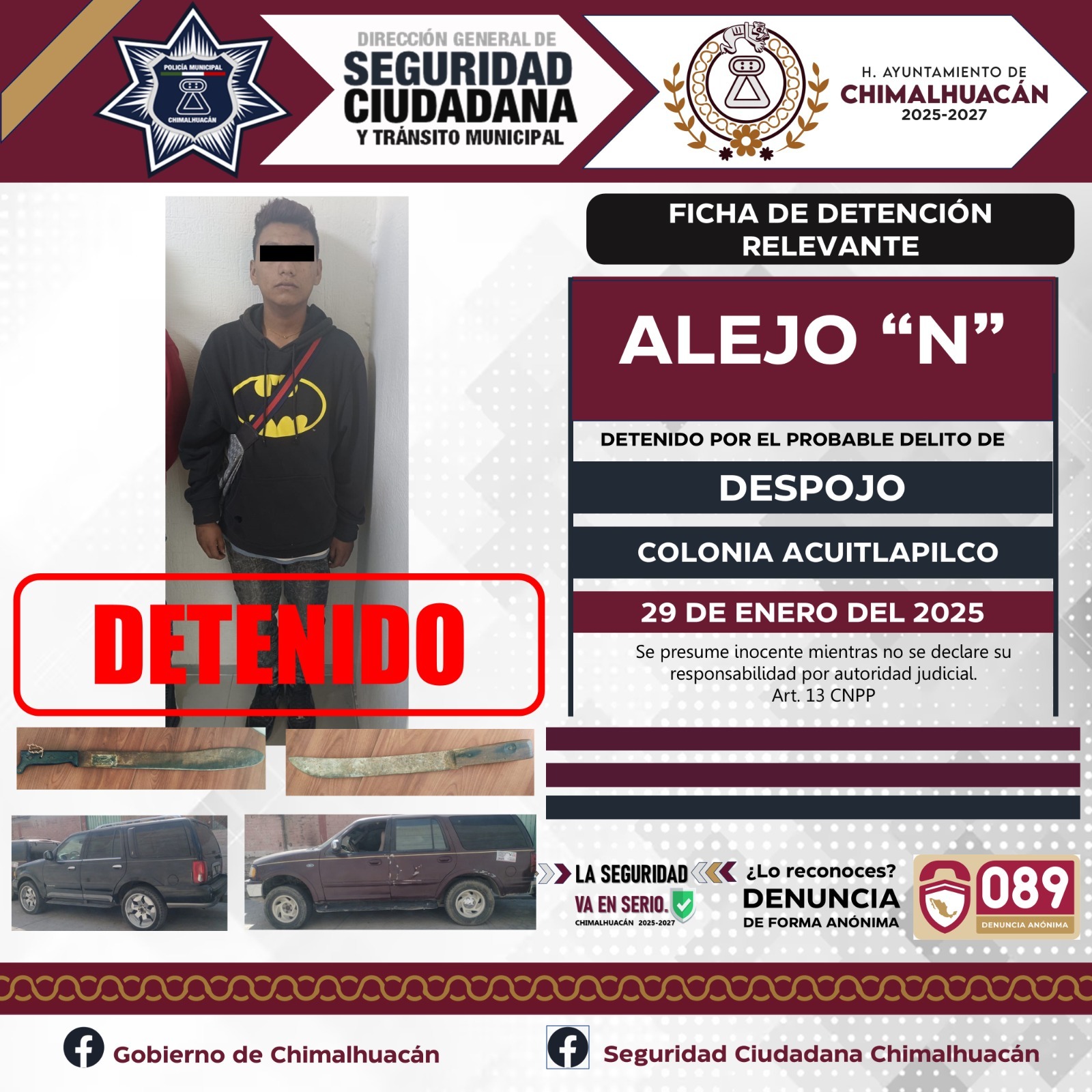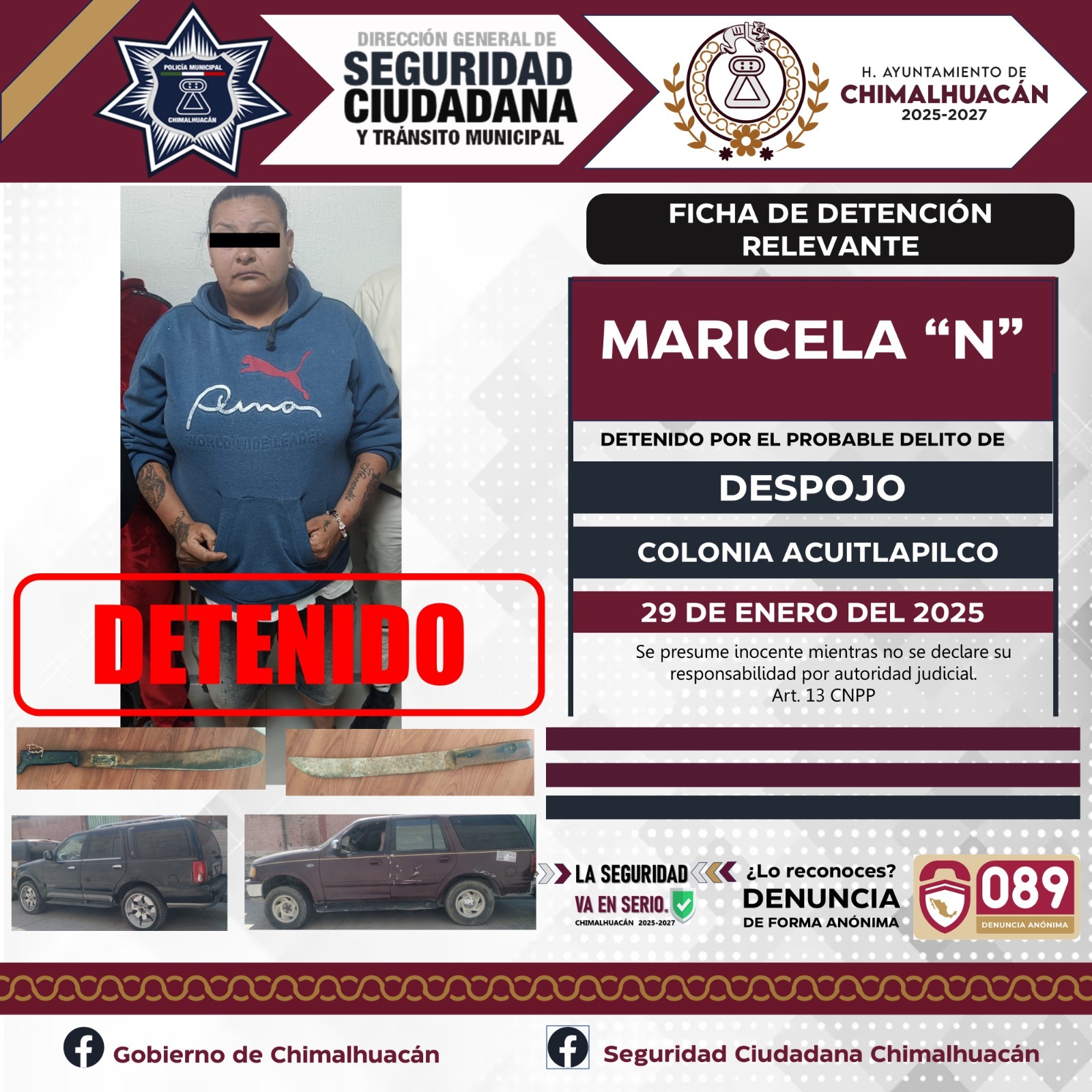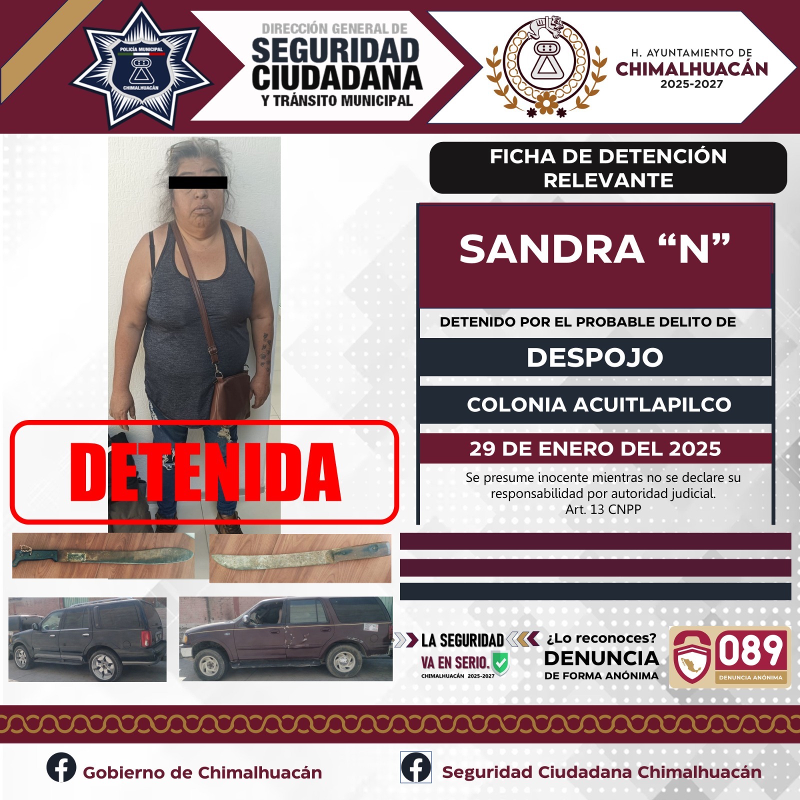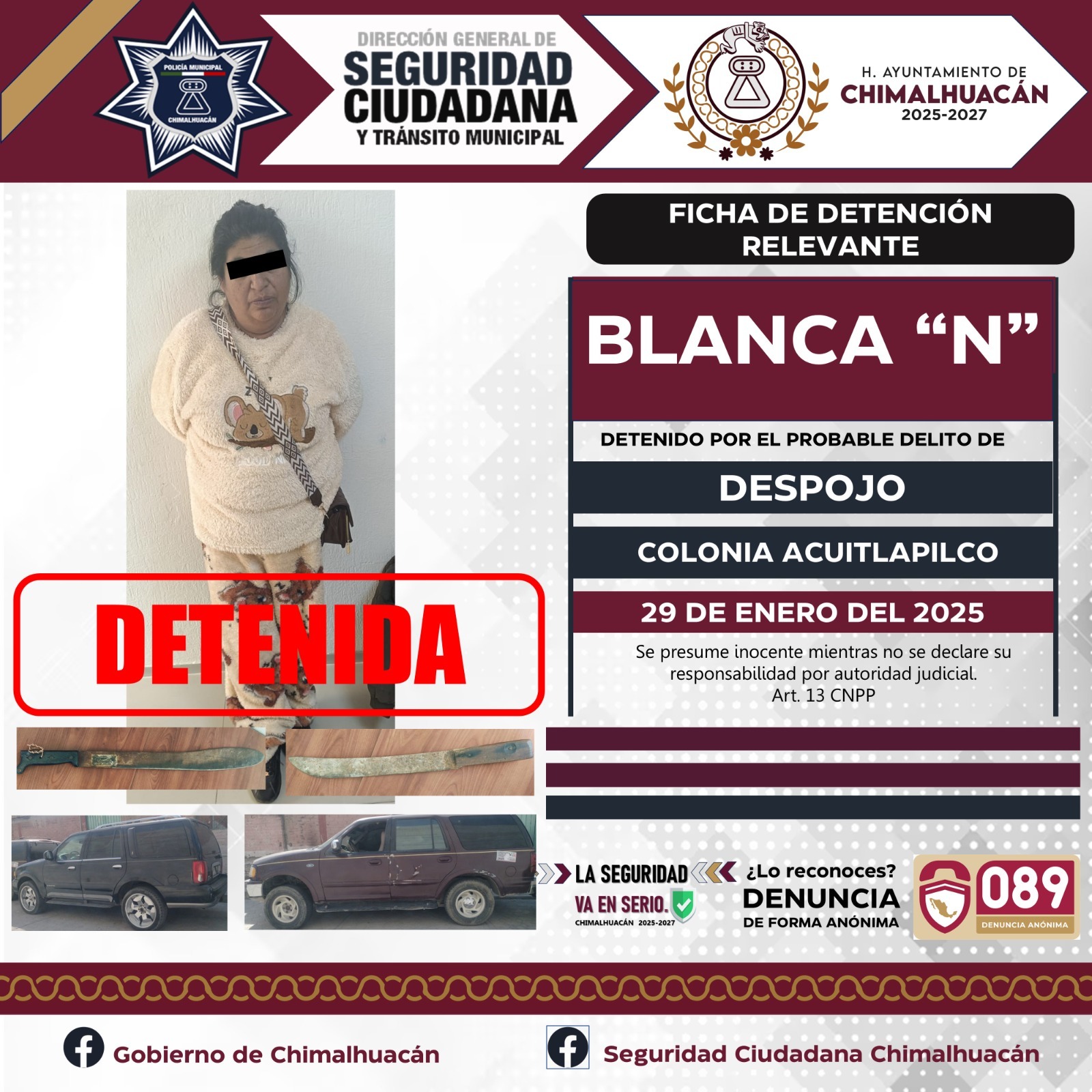 El pasado 28 de enero del 2025 mientras se llevaba a cabo un dispositivo en la colonia Acuitlapilco. Elementos operativos de la Policía Municipal, elementos de la Secretaría de Seguridad del Estado de México (SSEM) y la Fiscalía del Estado de México, fueron informados de parte de uno de nuestros ciudadanos quien mencionaba que se encontraba al interior de su domicilio cuando ingresó un grupo de personas para sacarlo de su propiedad, y es como gracias a la pronta actuación de los elementos se logra la detención de este grupo de 11 personas quienes dijeron llamarse Brayan “N”, Sandra “N”, Israel “N”, Blanca “N”, Luis “N”, Evelyn “N”, Maricela “N”, Kiyotaka “N”, Alejo “N”,Jimmy “N” y Brayan Jesús “N” mismos que se les da de conocimiento del motivo de su detención y se les informa de sus derechos que la ley les consagra fueron puestos a disposición ante la fiscalía general de justicia misma que se encargaba de definir su situación jurídica y legal.