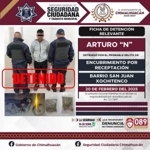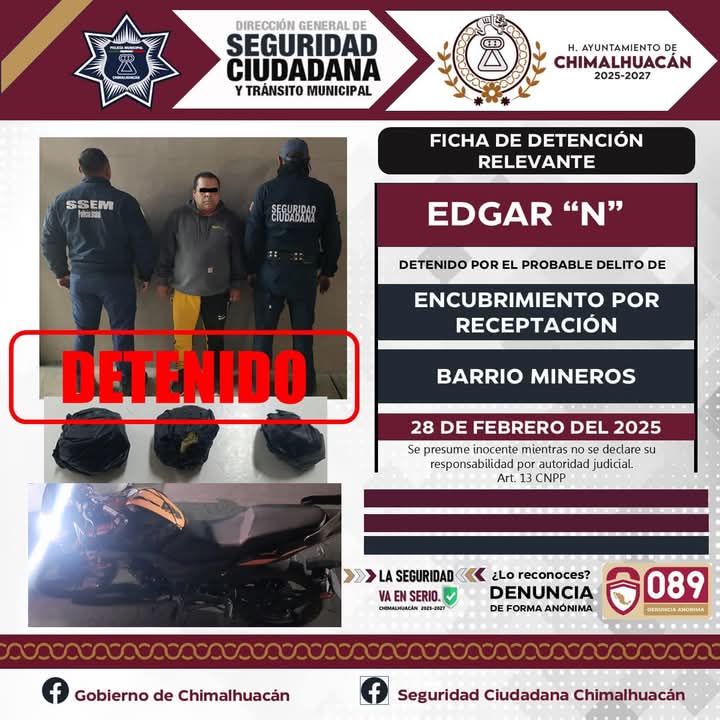 El segundo caso tuvo lugar el 28 de febrero en el barrio Mineros. En esta ocasión, elementos de la policía municipal de Chimalhuacán, en coordinación con la Secretaría de Seguridad del Estado de México, implementaron un dispositivo de seguridad. Durante el operativo, un individuo identificado como Edgar “N” fue sorprendido mientras viajaba en una motocicleta que, al igual que en el caso anterior, tenía reporte de robo. Al intentar huir, fue detenido y, tras ser informado de sus derechos, Edgar “N” también fue puesto a disposición de la Fiscalía para determinar su situación jurídica.