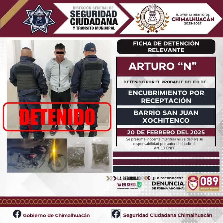 El sujeto, identificado como Arturo “N”, fue inspeccionado y al verificar la motocicleta en el Centro de Control, Comando Comunicación y Cómputo (C4) del municipio, se confirmó que esta contaba con reporte de robo. Por tal motivo, Arturo “N” fue detenido y puesto a disposición de la Fiscalía General de Justicia del Estado de México, donde se definirá su situación legal.