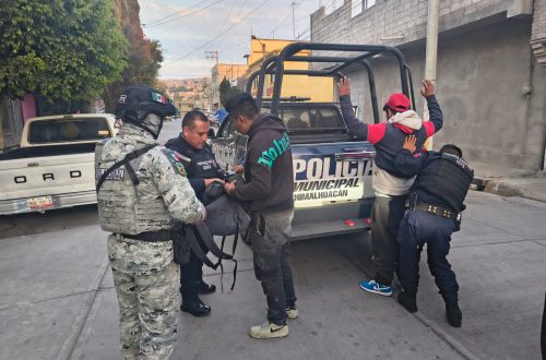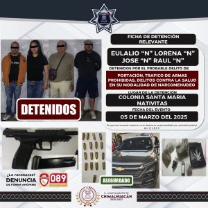 Al llegar al lugar, un dispositivo de elementos operativos verificaron la situación y los sospechosos intentaron evadirlos, por lo cual se les interceptó e inspeccionó. Entre las pertenencias de los hoy detenidos se encontraron diversos envoltorios transparentes que contenían hierba seca con características similares a la marihuana, así como un arma de fuego y varios cartuchos.