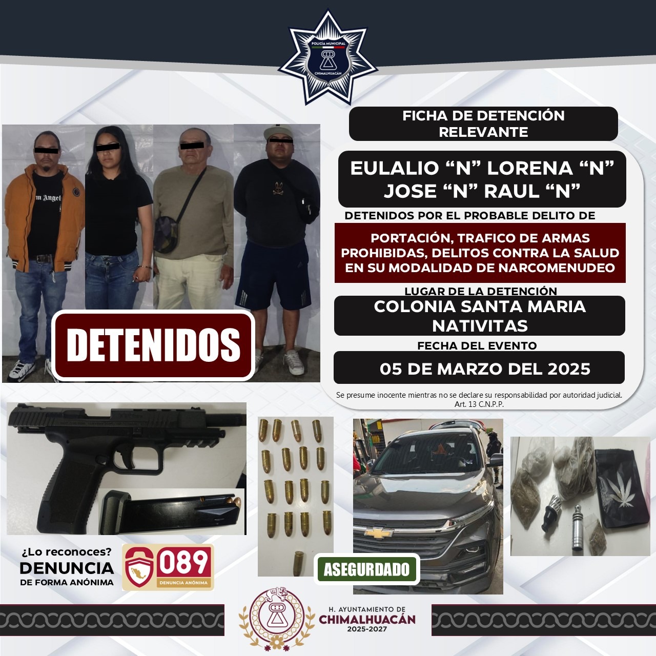 Policías municipales acudieron a la colonia Santa María Nativitas, derivado de una denuncia ciudadana recibida en el Centro de Control, Comando Comunicación y Cómputo (C4) de Chimalhuacán, en la cual se reportó la presencia de una camioneta con personas abordo, mismas que presentaban una actitud inusual.