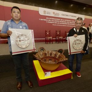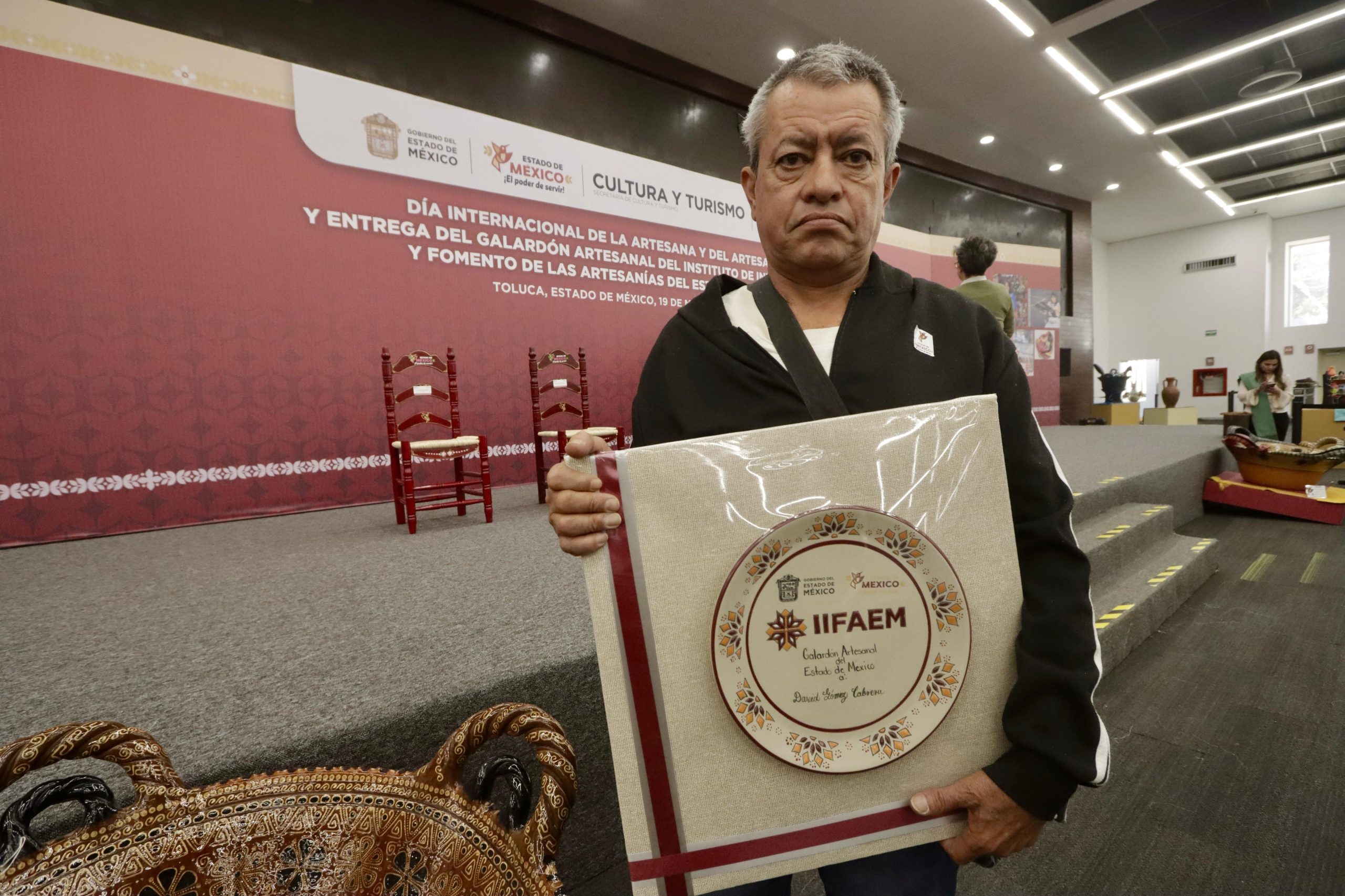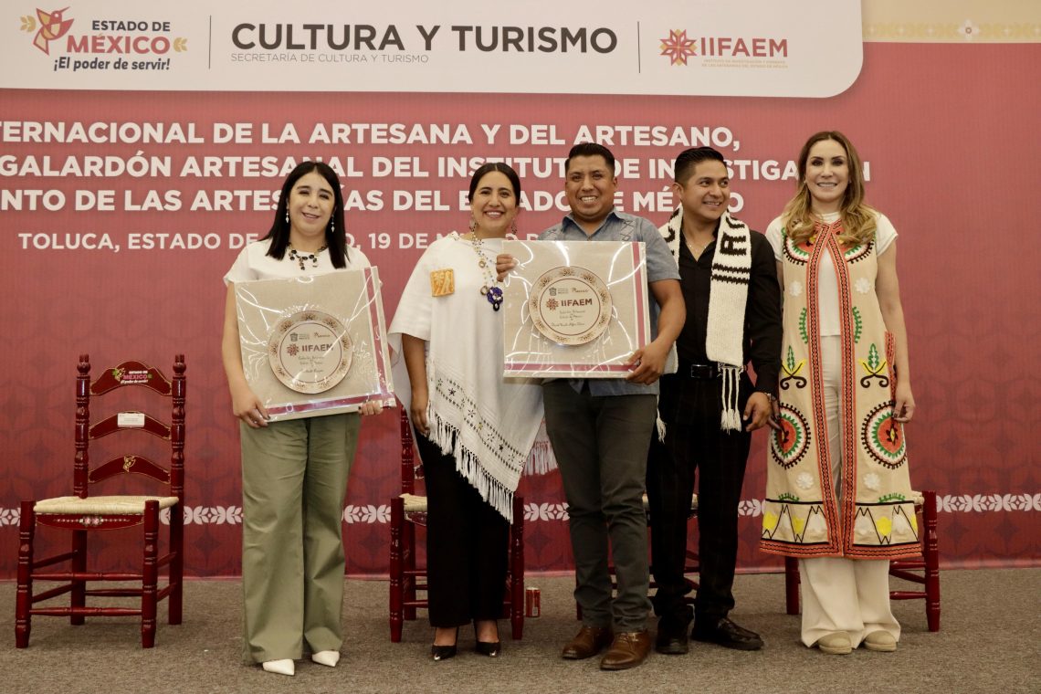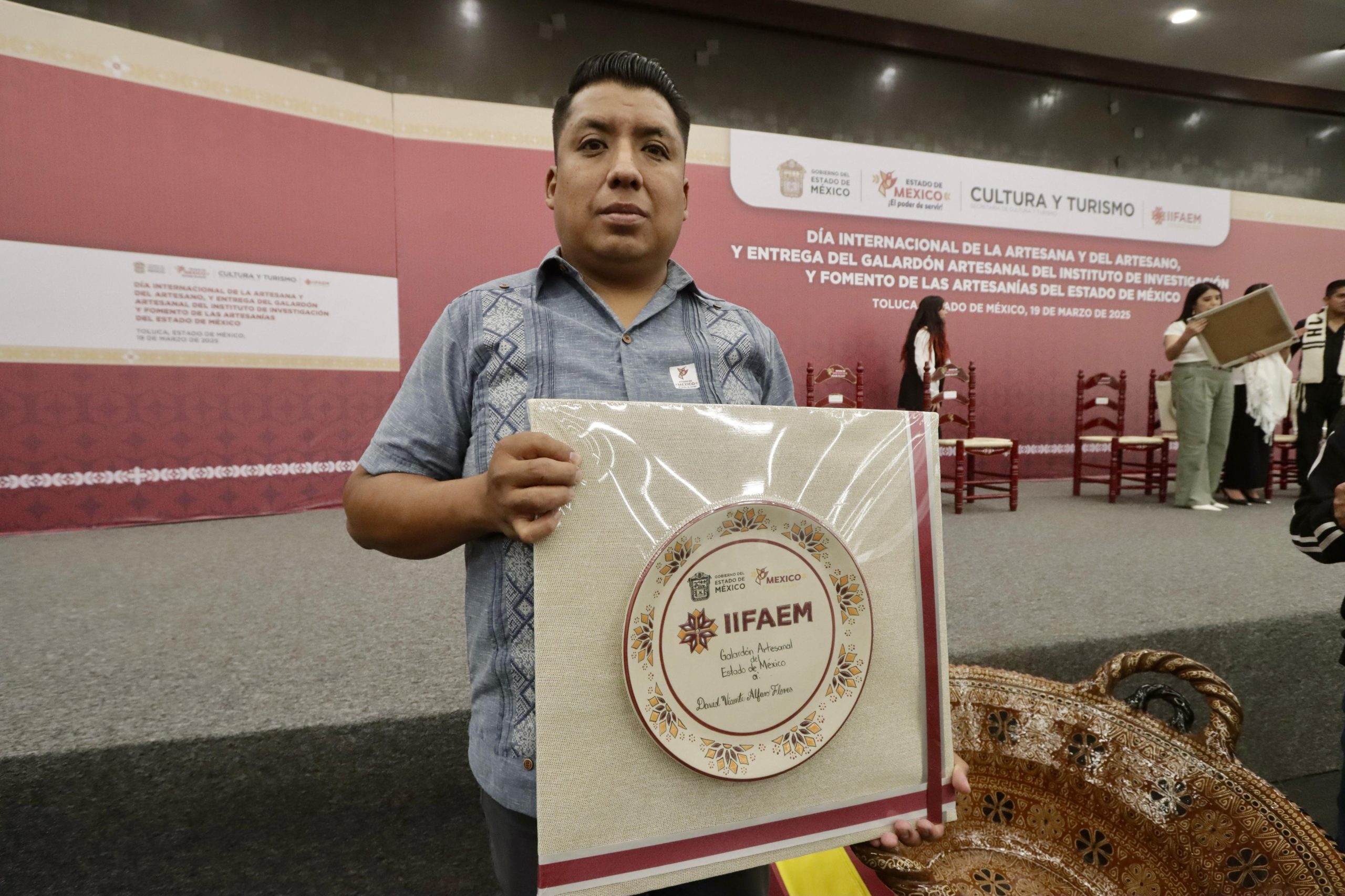 En el marco del Día Internacional de la Artesana y del Artesano, la gobernadora del Estado de México, Delfina Gómez Álvarez, entregó el Galardón Artesanal del Instituto de Investigación y Fomento de las Artesanías del Estado de México (IIFAEM) a dos destacados artesanos de Chimalhuacán: a David Vicente Alfaro Flores, de la rama artesanal de Lapidaria y Cantera, galardonado por su mérito artesanal, y David Gómez Cabrera, de la rama de Hueso y Cuerno, premiado por su trayectoria artesanal.