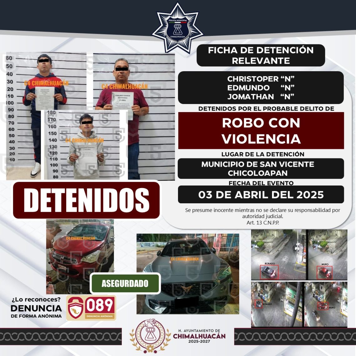 En una operación coordinada entre el Centro de Control, Comando, Comunicación y Cómputo (C4) de Chimalhuacán y el C5 del Valle de México, elementos de la Secretaría de Seguridad del Estado de México (SSEM) lograron la detención de tres hombres presuntamente involucrados en el robo con violencia de un vehículo. Durante el operativo fueron recuperados dos vehículos.