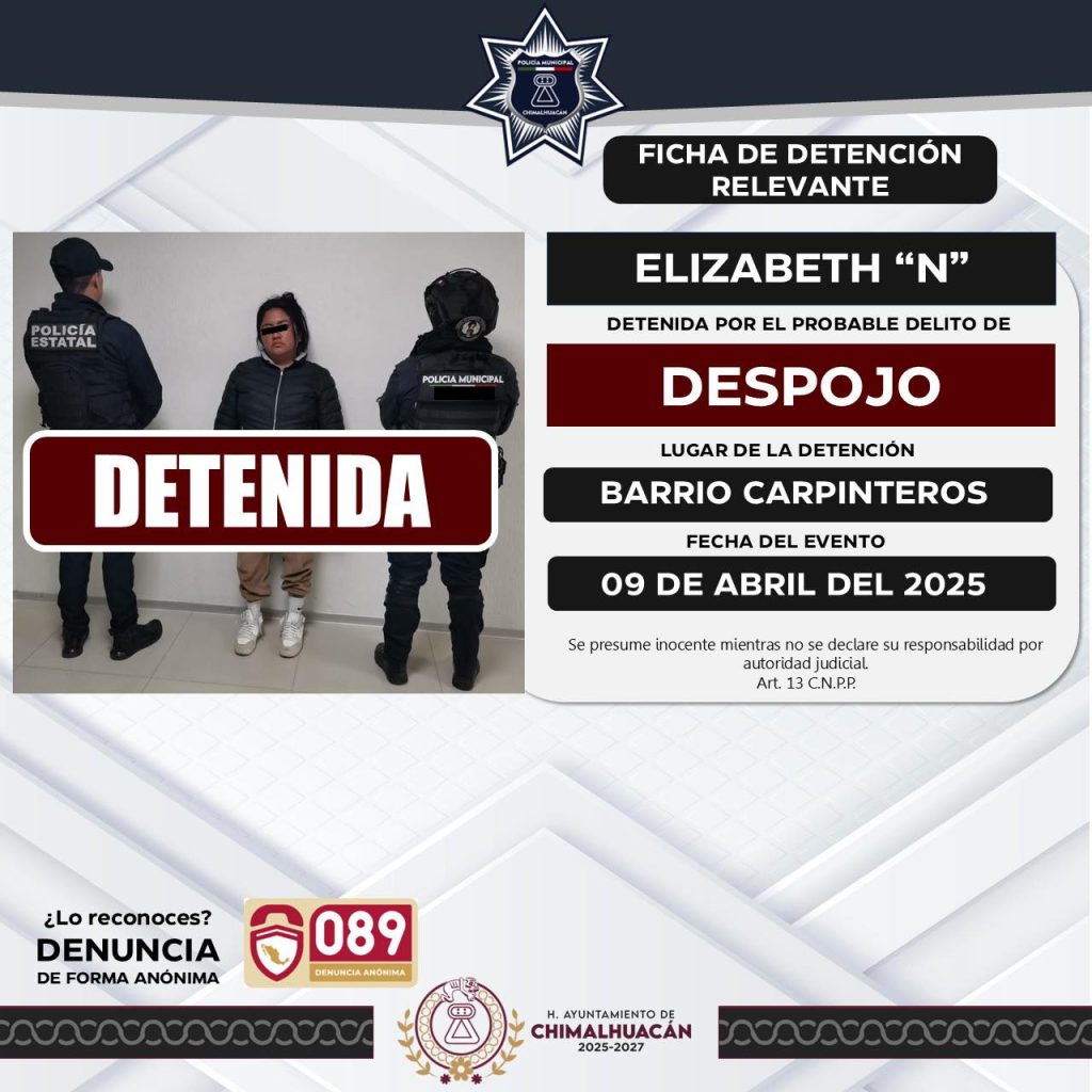 Efectivos de la Dirección General de Seguridad Ciudadana y Tránsito Municipal de Chimalhuacán, en coordinación con la Secretaría de Seguridad del Estado de México (SSEM), detuvieron a una mujer presuntamente involucrada en un intento de despojo de casa habitación.