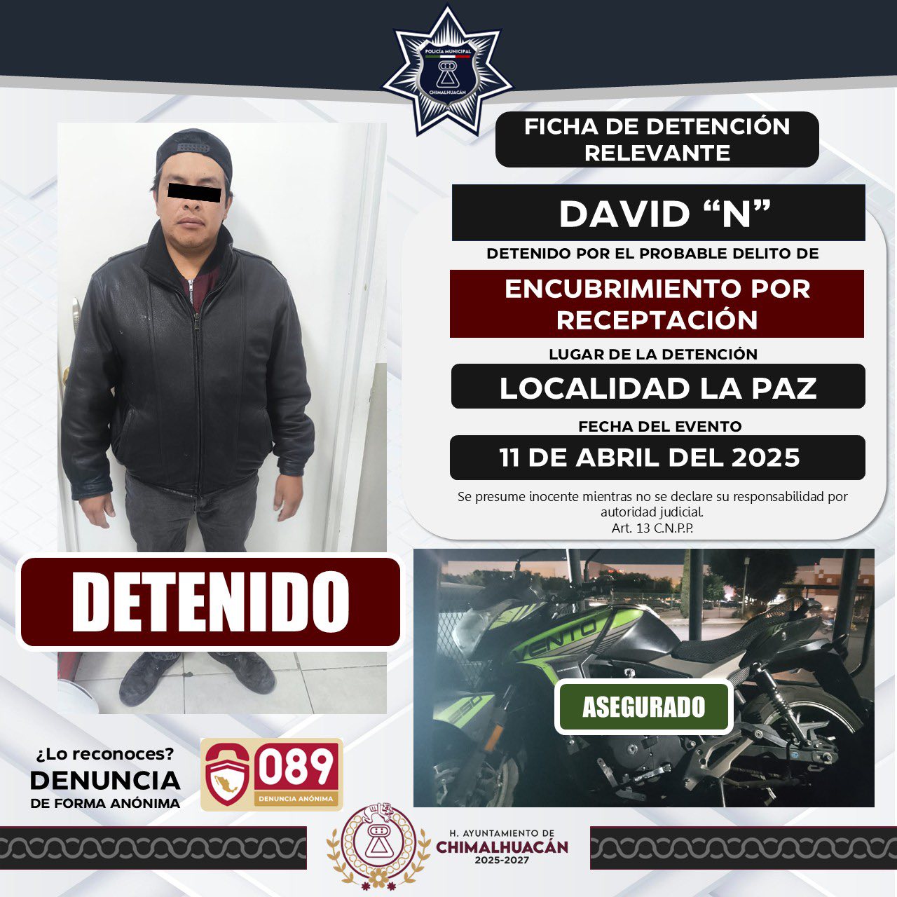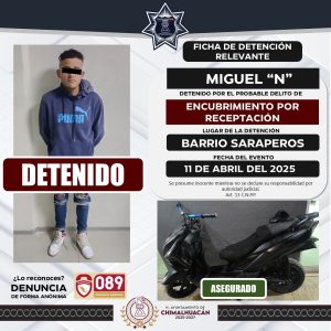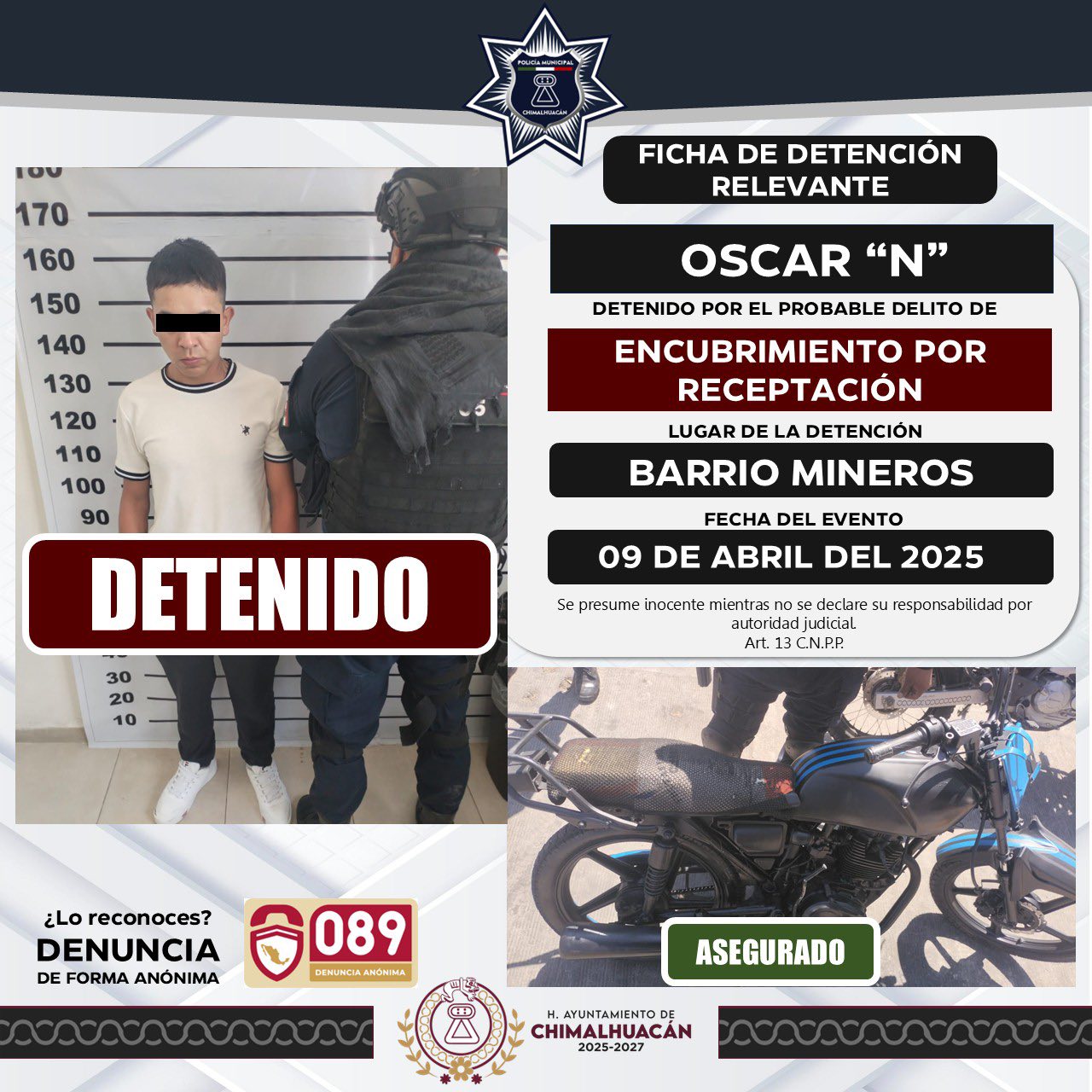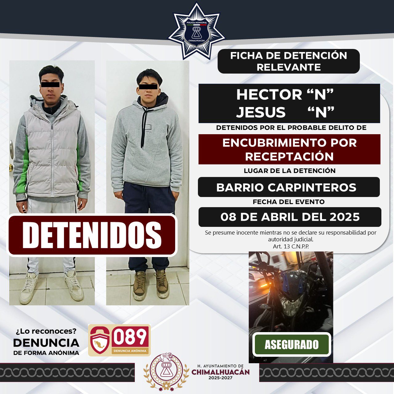 Durante la realización de operativos de seguridad, efectivos de la Dirección General de Seguridad Ciudadana y Tránsito Municipal de Chimalhuacán, en coordinación con elementos de la Secretaría de Seguridad del Estado de México (SSEM) y la Guardia Nacional, aseguraron cinco motocicletas y detuvieron a seis masculinos por el probable delito de encubrimiento por receptación.
