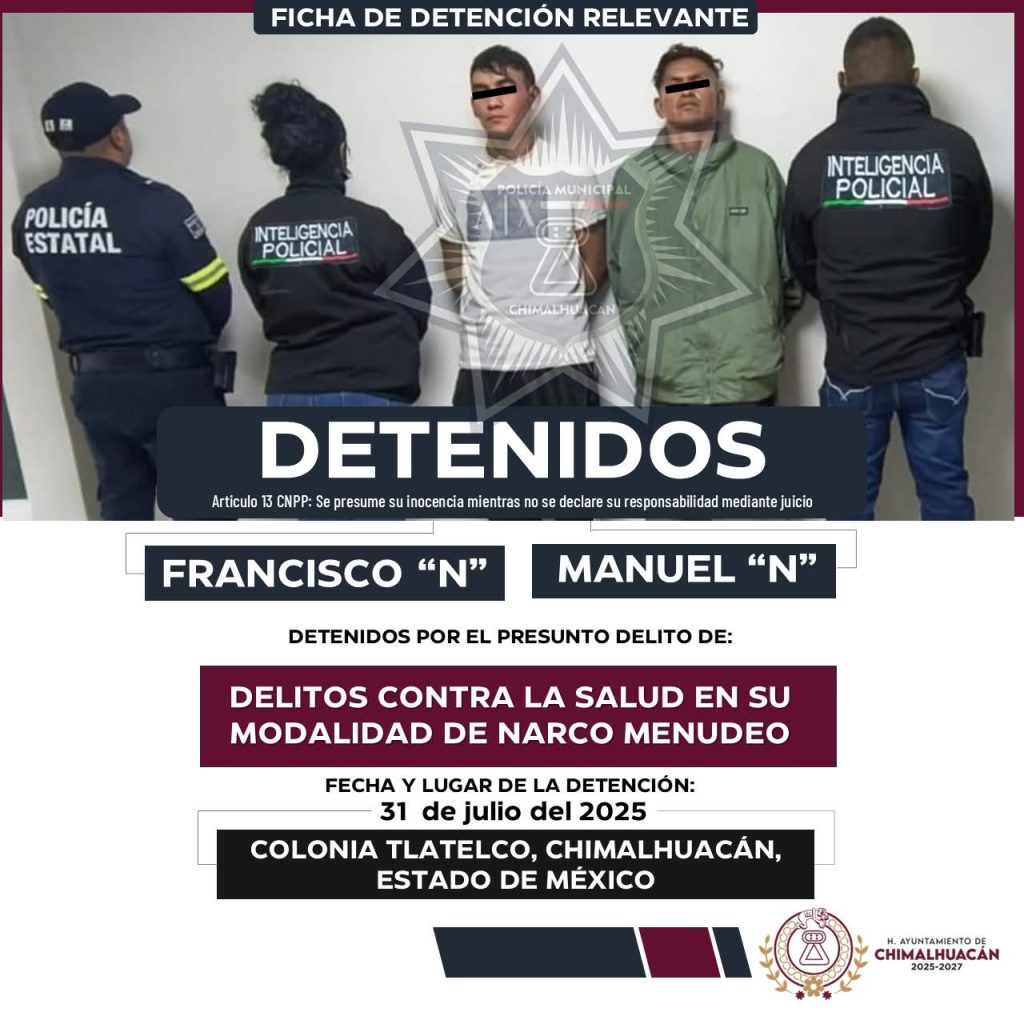 Cuatro hombres fueron detenidos en la colonia Tlatelco, en Chimalhuacán, por presunta posesión de sustancias prohibidas. Las detenciones fueron resultado de dos intervenciones distintas, una durante patrullajes implementados para preservar la seguridad en el municipio y otra derivada de acciones conjuntas de prevención entre dependencias de seguridad municipales y estatales, en el marco de los acuerdos establecidos en las Mesas de Pacificación por la Paz.