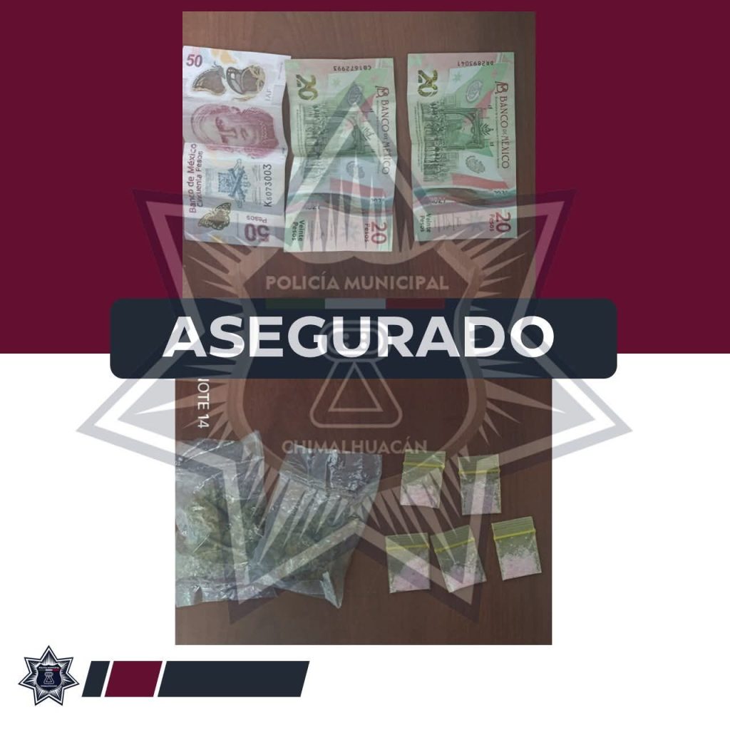 En la primera acción, elementos de la policía municipal realizaban recorridos de vigilancia en la zona cuando observaron a dos personas que intentaron evadirlos. Ante esta conducta, los oficiales aplicaron una inspección preventiva conforme a los protocolos establecidos. Los individuos fueron identificados como Ángel “N” y Carlos “N”. En la revisión se les encontraron varios envoltorios que contenían una sustancia cristalina con características similares al cristal y hierba verde seca con apariencia de marihuana.