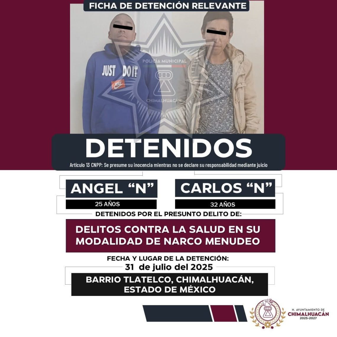 Cuatro hombres fueron detenidos en la colonia Tlatelco, en Chimalhuacán, por presunta posesión de sustancias prohibidas. Las detenciones fueron resultado de dos intervenciones distintas, una durante patrullajes implementados para preservar la seguridad en el municipio y otra derivada de acciones conjuntas de prevención entre dependencias de seguridad municipales y estatales, en el marco de los acuerdos establecidos en las Mesas de Pacificación por la Paz.
