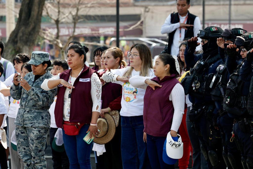 Con la finalidad de reforzar la proximidad social de la Guardia Nacional y la policía municipal con la población, niñas y niños que asisten a los cursos de verano impartidos en el DIF y la Casa de Cultura de Chimalhuacán participaron en una ceremonia de honores a la bandera que les permitió conocer de cerca a elementos de ambas corporaciones.