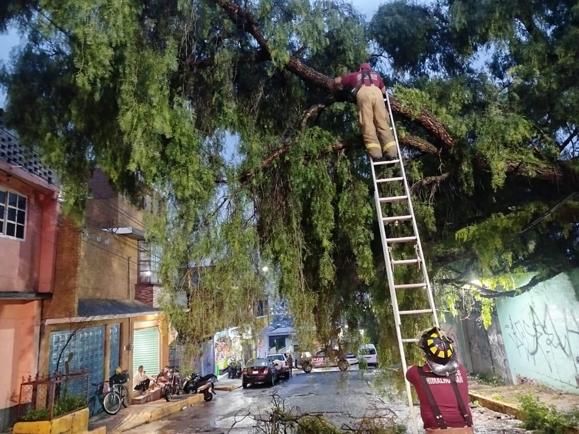 De manera simultánea, un árbol de la especie pirul, ubicado sobre la calle Benito Juárez, entre Montes de Oca y Canarios, se inclinó sobre una barda y representaba un riesgo para la vialidad. Protección Civil realizó el seccionamiento de las ramas más pesadas y determinó que el retiro completo requerirá el uso de una barcaza, debido a la altura de las ramas y la proximidad de cables de telefonía. El área quedó delimitada con cinta de seguridad para proteger a la población y facilitar las labores de limpieza.