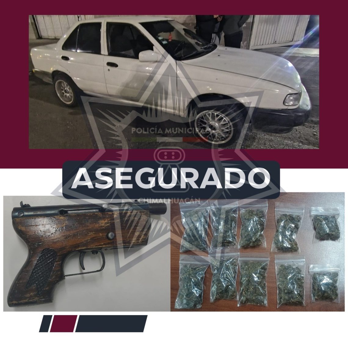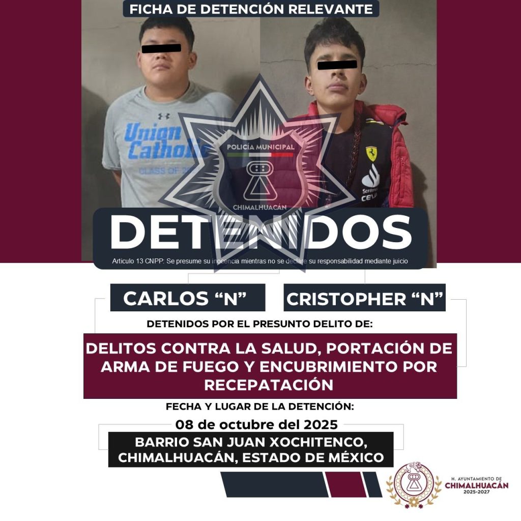 Como parte de las acciones coordinadas del Mando Único y en el marco de la Estrategia Operativa Zona Oriente, elementos de la policía municipal de Chimalhuacán, en colaboración con la Secretaría de Seguridad del Estado de México, lograron la detención de tres masculinos por su probable participación en diversos delitos relacionados con portación de arma de fuego y posesión de sustancias prohibidas.