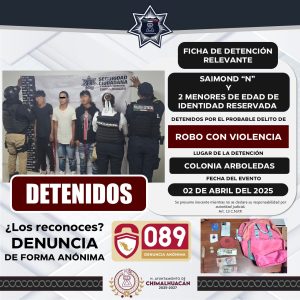 POLICÍA MUNICIPAL DE CHIMALHUACÁN DETIENE A 3 HOMBRES POR PROBABLE DELITO DE ROBO CON VIOLENCIA